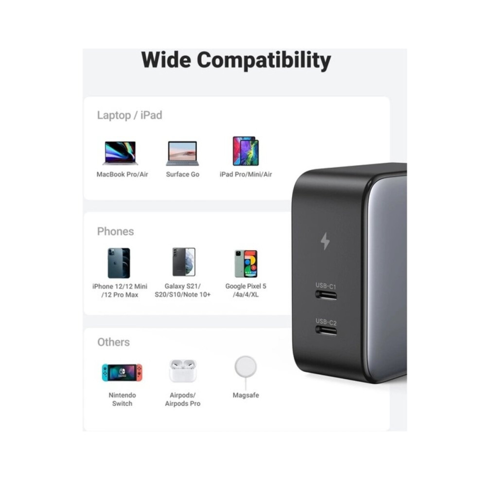 Зарядное устройство Ugreen 100W с 2 портами USB-C поддерживает Power Delivery 3.0, Quick Charge 4.0+/3.0, SCP, AFC, 5V/2.4А, Galaxy 45W Super Fast Charging II, PPS для быстрой зарядки. 0 до 100% всего за 1.9 часы.Полностью заряжен. Также поддерживает выход USB-C мощностью 20W для мобильных телефонов.