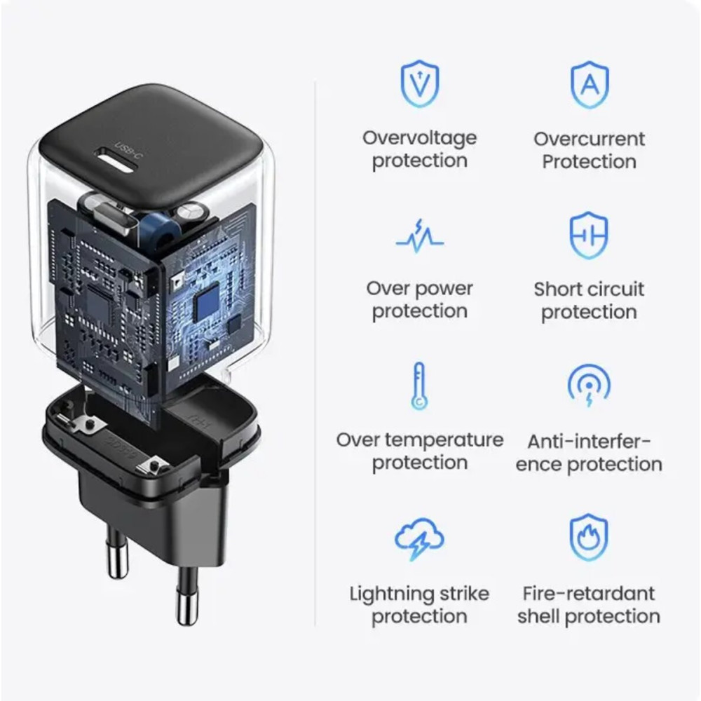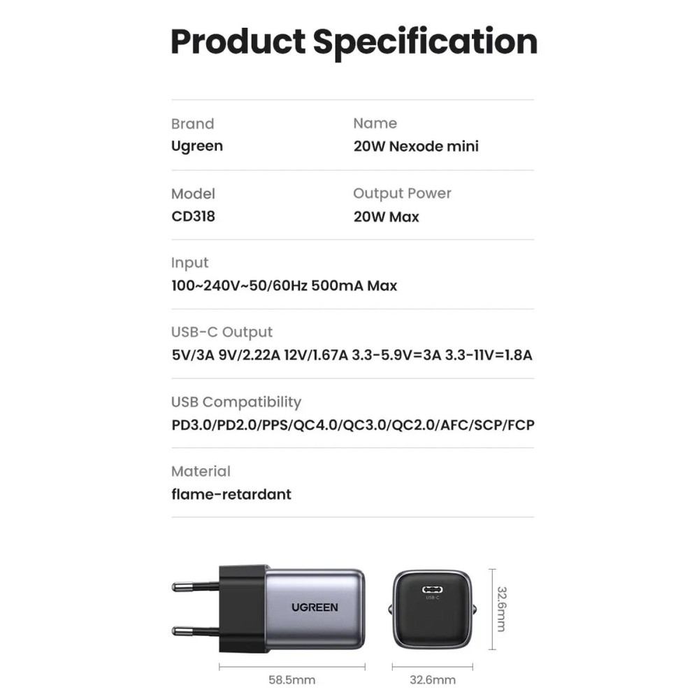 Зарядное устройство UGREEN CD318 Nexode mini 20W Charger EU (UGR-90664) позволит зарядить ваши устройства за очень короткое время, что делает его идеальным выбором для работы в офисе или дома. Мощность зарядного устройства составляет 20 Вт. Благодаря технологии производства зарядное устройство имеет относительно компактные размеры. Модель CD318 поддерживает протоколы быстрого зарядки, включая: PD, QC, AFC, SCP, FCP, PPS, что также обеспечивает безопасность использования. Вы можете быть уверены, что зарядное устройство отрегулирует текущий параметр в соответствии с потребностями вашего устройства.