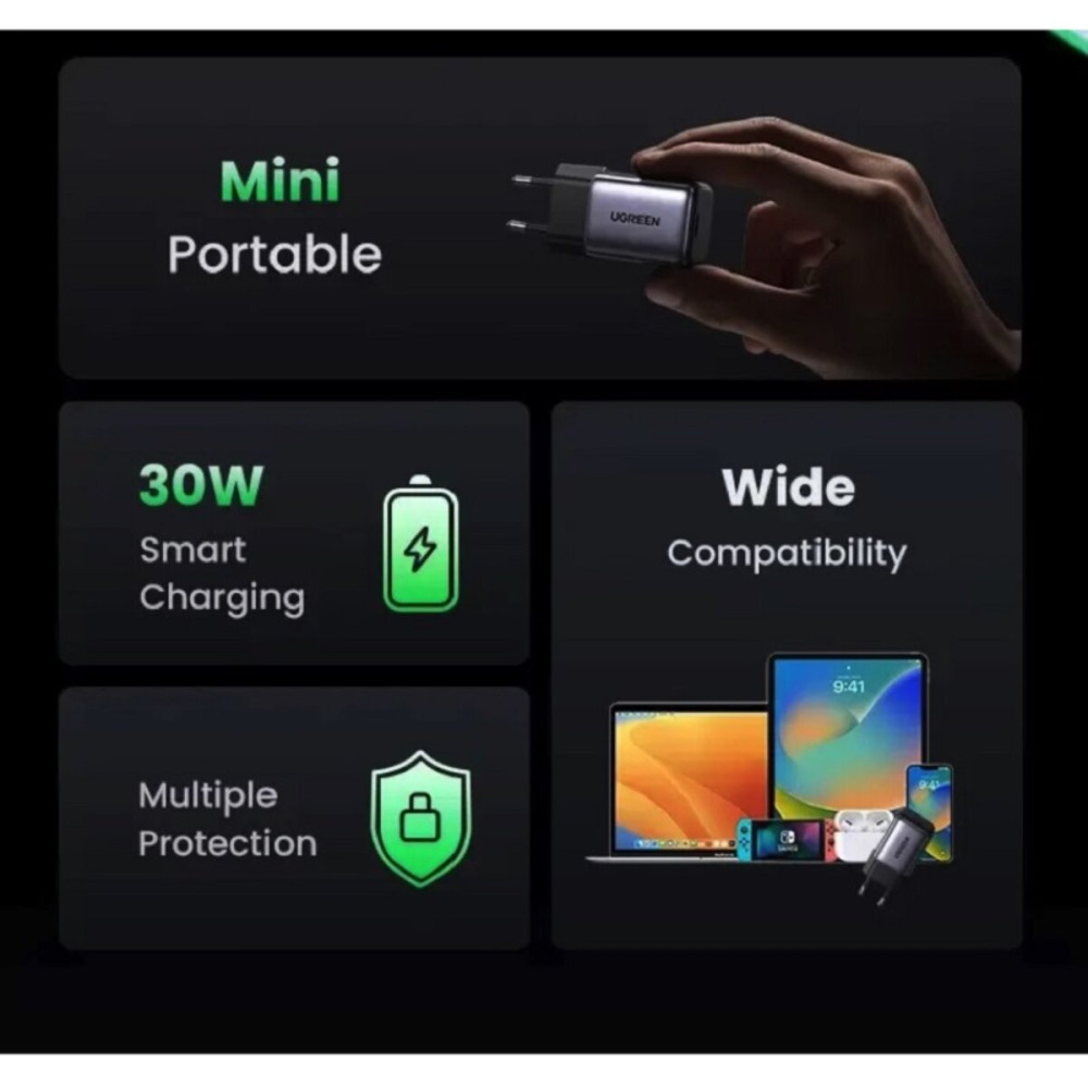 Наслаждайтесь быстрой зарядкой устройств. Зарядное устройство Ugreen CD319 обеспечивает мощность до 30W и отличается широкой совместимостью. Она также гарантирует безопасное использование. Кроме того, благодаря использованию технологии GaN удалось значительно увеличить производительность устройства при одновременном уменьшении его размеров – так что оно всегда будет у вас под рукой.