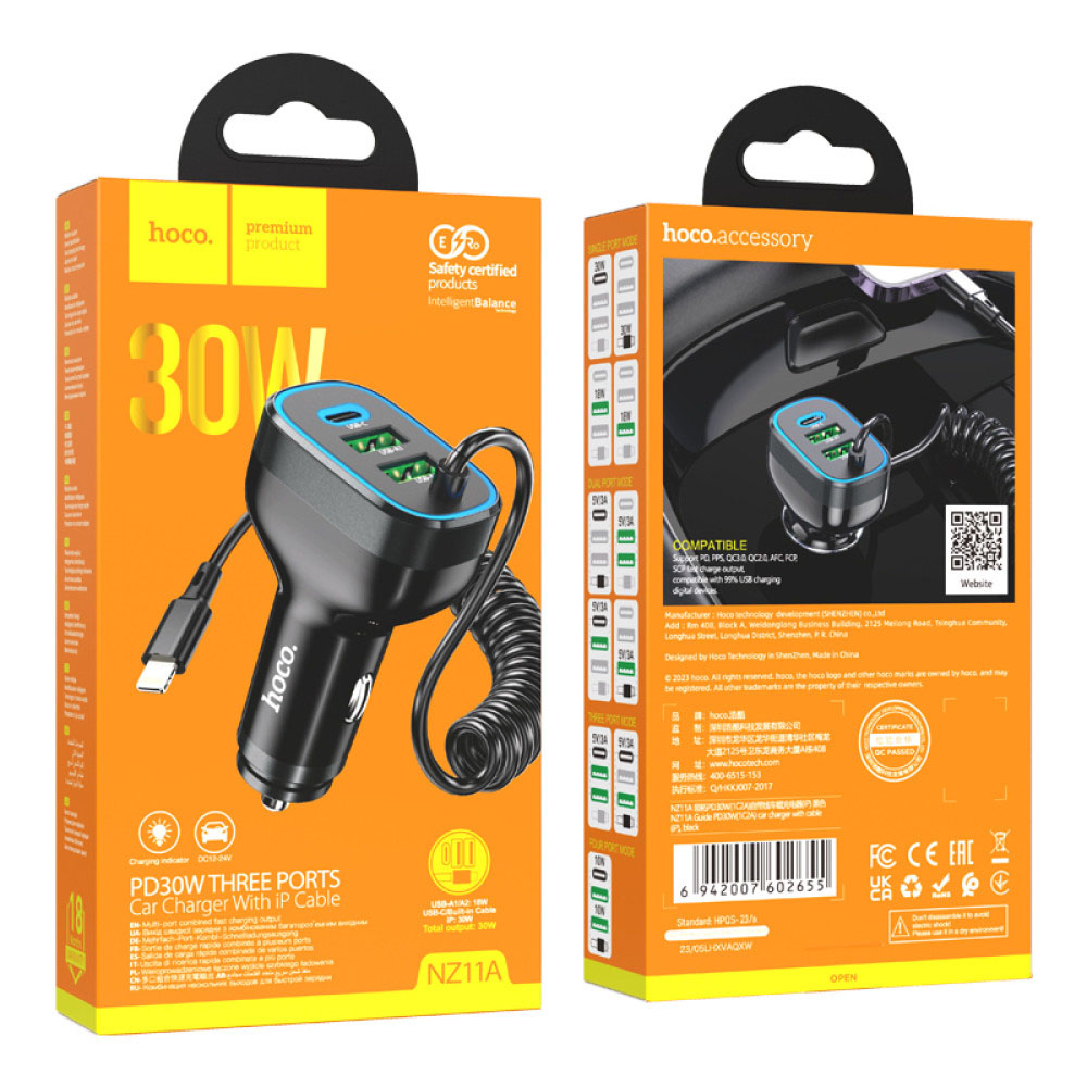 Автомобильное зарядное устройство HOCO NZ11A 2USB / 1Type-C 30W 3A с кабелем Lightning, Black