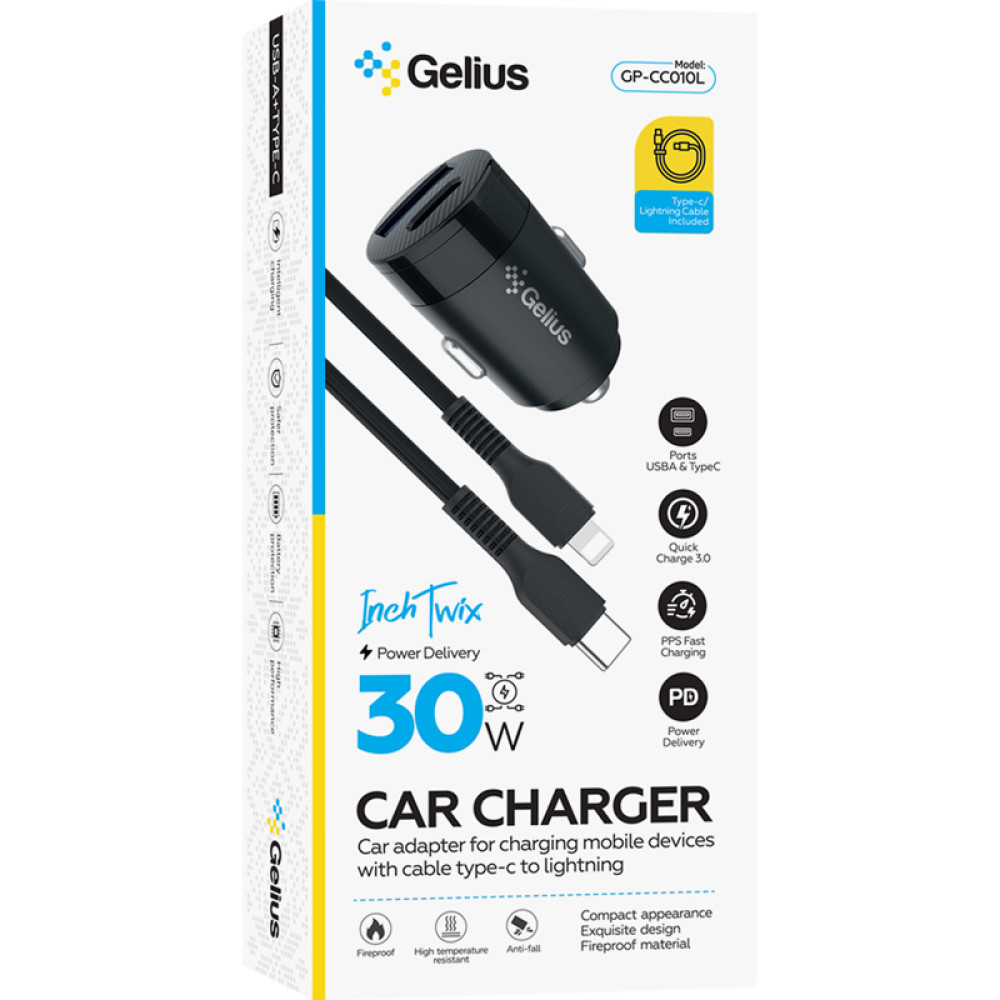Gelius Pro Inch Twix GP-CC010L – это автомобильное зарядное устройство, способное зарядить одновременно два гаджета. В нем встроены два порта USB и Type-C. Зарядка происходит через прикуриватель.