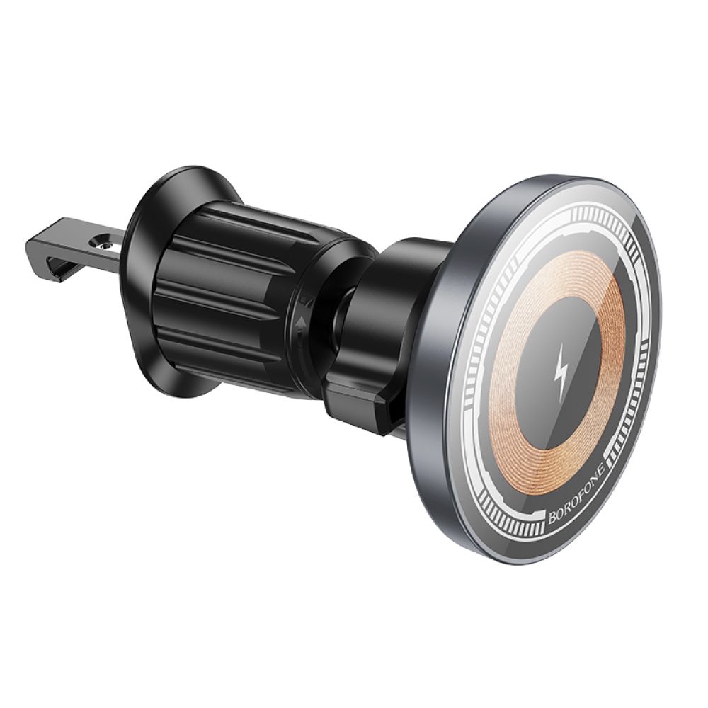 Автодержатель Borofone BH211 Riley – это современный, функциональный аксессуар, созданный для обеспечения максимально комфортного и безопасного использования смартфона в автомобиле. Он лаконично сочетает в себе функции универсального магнитного держателя и беспроводного зарядного устройства для iPhone и других смартфонов, которые поддерживают технологии MagSafe и Qi. Модель реализована в уникальном, стильном дизайне с прозрачной передней панелью, через которую видна медная катушка беспроводной зарядки. Она идеально впишется в салон любого авто, не будет мешать и станет его неотъемлемой деталью. Её практичная конструкция с шаровым шарниром позволяет легко одной рукой зафиксировать смартфон с возможностью регулировки угла наклона и его поворота на 360° вокруг своей оси. Корпус держателя качественно собран, изготовлен из прочной комбинации ABS пластика и закалённого стекла, дополнен деталями из силикагеля. Мощные встроенные магниты гарантируют надёжную фиксацию гаджета и расположены в точном соответствии с технологией MagSafe для полной совместимости с iPhone 12 и новее. Беспроводная зарядка смартфонов осуществляется с эффективностью преобразования энергии 75% и мощностью 5, 7.5, 10 и 15W. Держатель оснащён LED индикатором и разъёмом Type-C для подключения к источнику питания. Входное напряжение составляет 5V при силе тока 2A, 9V при 1.67A и 12V при 1.5A. Его установка на решётку дефлектора осуществляется с помощью усовершенствованного крепления, которое выполнено в виде крюка. Автодержатель комплектуется кабелем Type-C и металлическим кольцом.