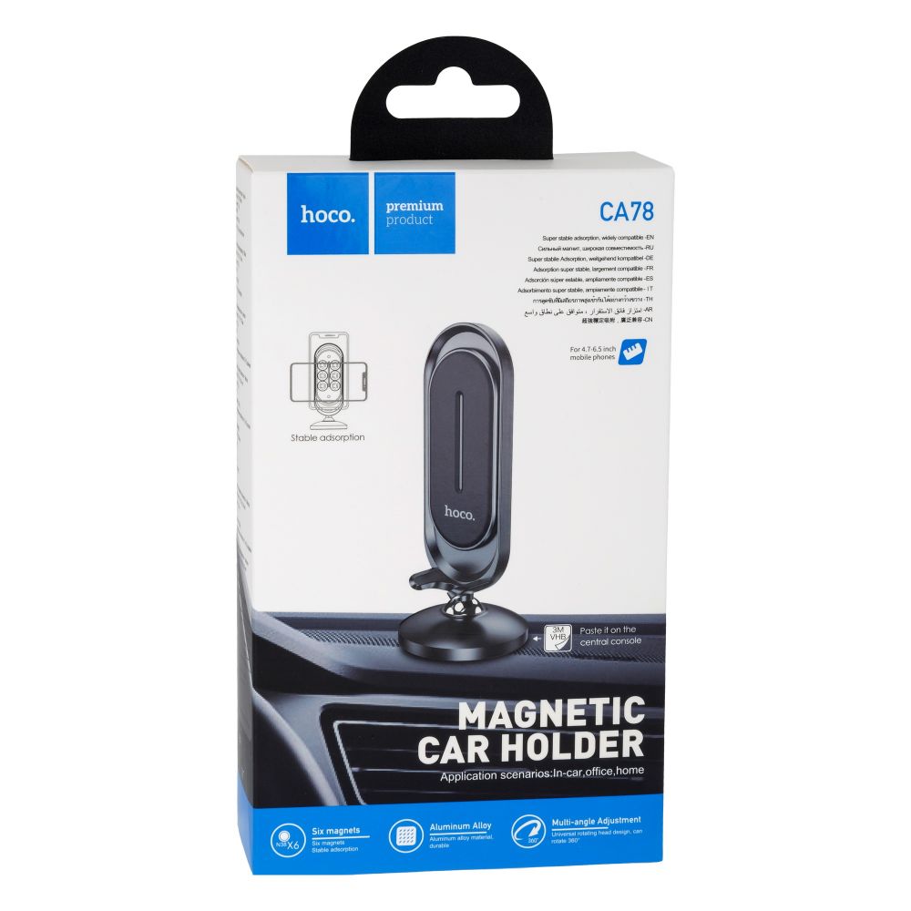 Автодержатель Hoco CA78 Karly – компактный и простой в использовании аксессуар. Модель поможет надежно зафиксировать смартфон в автомобиле и предоставит возможность комфортного его использования, также, может применятся и дома и в офисе. Конструкция устройства позволяет регулировать поворот удерживаемого гаджета, обеспечивает свободный доступ к его разъёмам и кнопкам. Аксессуар лаконично впишется в интерьер любого авто, благодаря своим компактным размерам и современной реализации. Для изготовления держателя используется алюминиевый сплав с оксидным покрытием, предотвращающим коррозию, и силикон, накладка из которого поможет избежать образования потертостей на удерживаемом устройстве. Магнитная фиксация телефона на держателе осуществляется посредством установки, входящих в комплект, металлических пластин на обратной стороне задней крышки телефона или под чехлом. На горизонтальную поверхность аксессуар крепится с помощью клейкой основы.