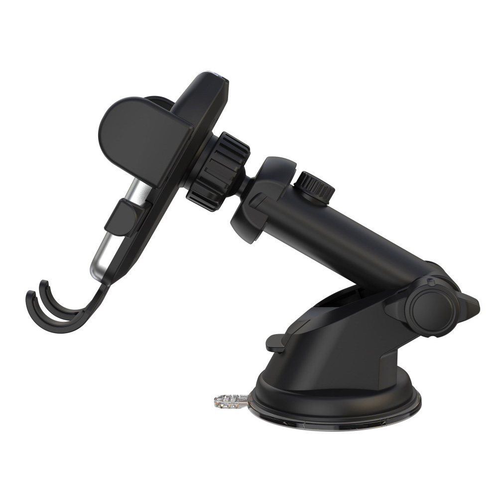 Крепится на лобовое стекло или торпедо с помощью вакуумного присоска, имеет телескопическую ножку длиной 10см с возможностью удлинения до 16см, шарнирный механизм для расположения телефона под любым удобным для обзора углом и держатель.