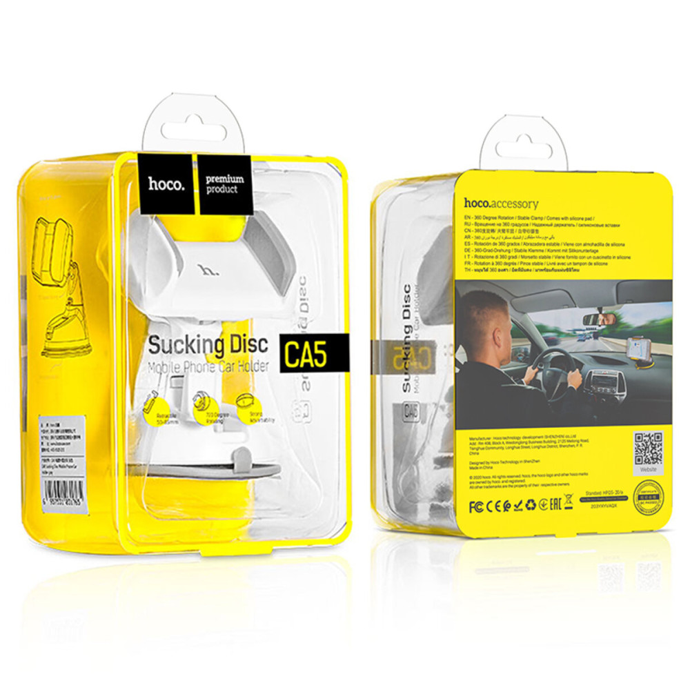 HOCO CA5 Suction Vehicle Holder Gray — стильный и компактный автомобильный держатель для смартфона. Он надежно крепится на панели приборов или лобовом стекле и удерживает устройство с помощью зажима. Держатель имеет шарнирное соединение, которое позволяет регулировать положение закрепленного телефона под максимально удобным углом.