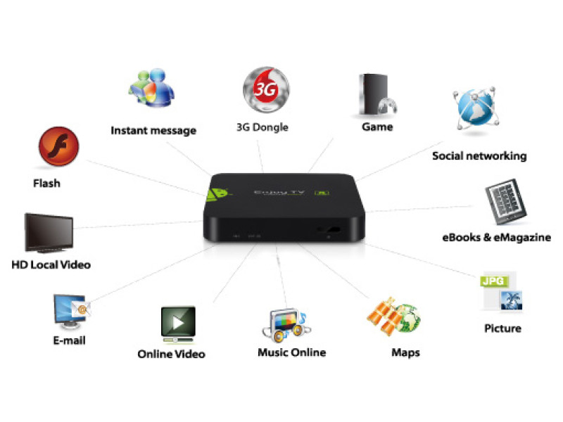 Приставку можно соединить с телевизором с помощью HDMI и AV выходов. Главной особенностью устройства, является SPDIF разъем для воспроизведения высококачественного звука. Подключается к сети приставка с помощью Wi-Fi а также к локальной сети, имеет поддержку 3D изображений а также всех форматов видео, вплоть до 4К.