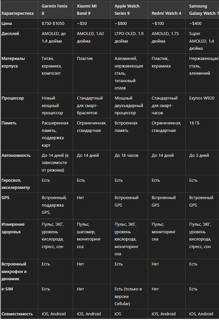 Главные конкуренты Garmin Fenix 8 – это модели от Apple (Apple Watch), Xiaomi, Samsung (Galaxy Watch) и других производителей. Рассмотрим сравнительные таблички с популярными моделями умных часов для Android и iOS.
