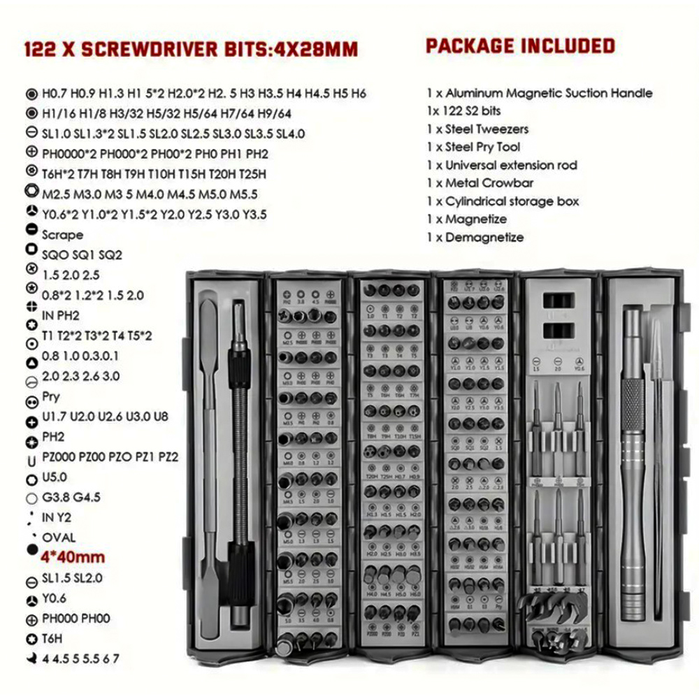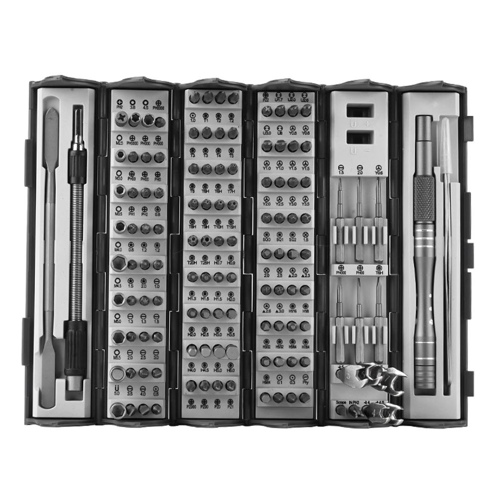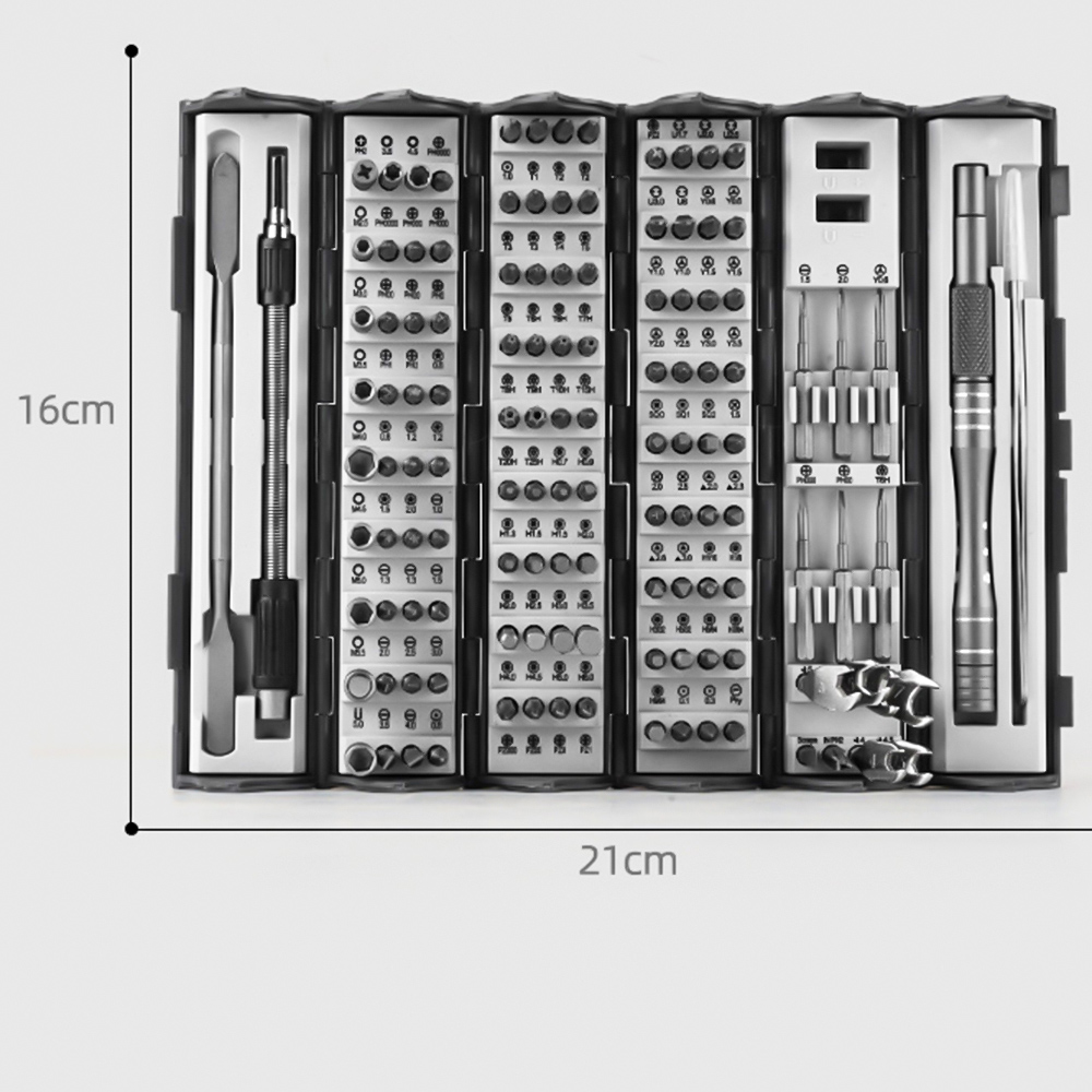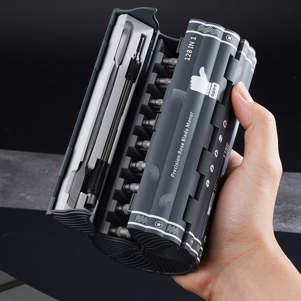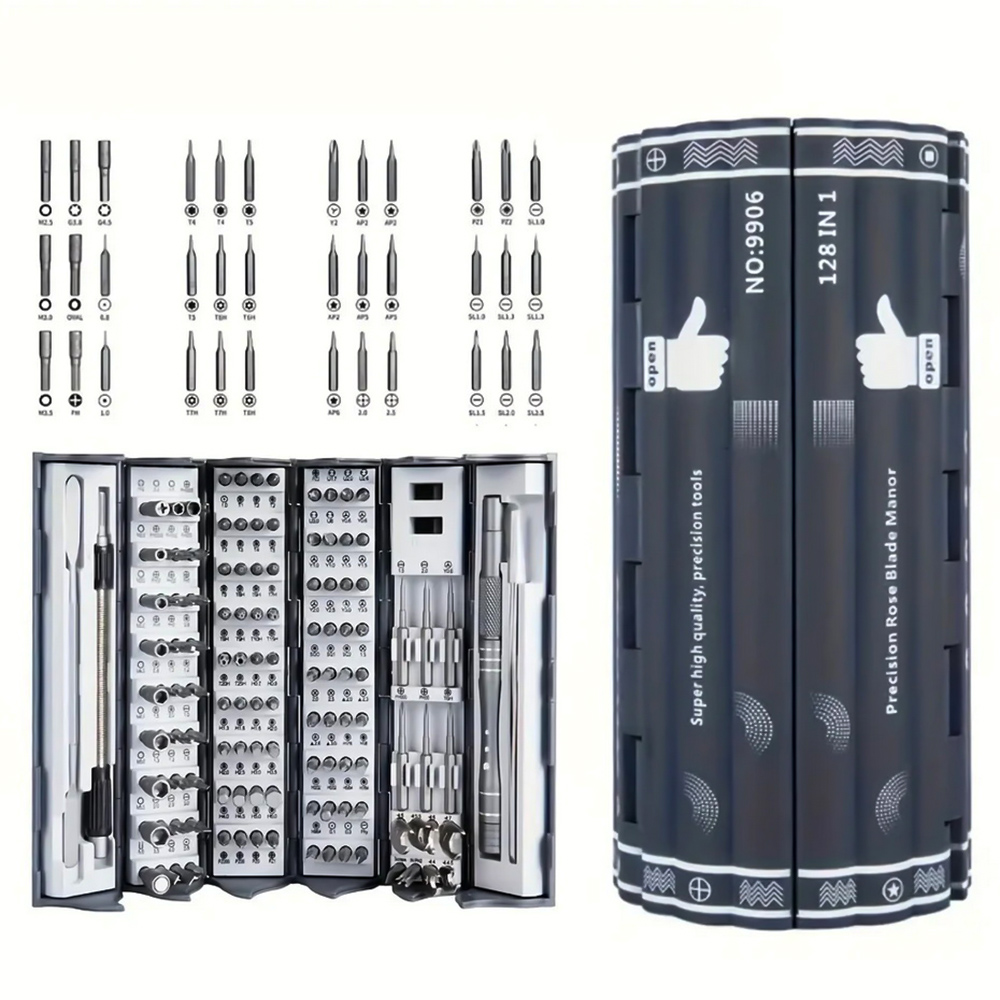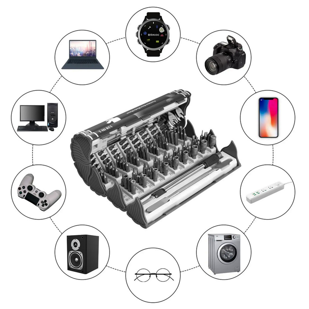 128 в 1 Multi-Tool Set – многофункциональный набор прецизионных отверток, предназначенный для ремонта мобильных телефонов, ноутбуков, планшетов, часов, консолей, мелкой бытовой техники и другой электроники. Большой выбор бит и вспомогательных аксессуаров делает его универсальным решением как для домашнего использования, так и для профессиональных мастерских. Благодаря прочным материалам, эргономичному дизайну и компактному футляру набор удобен в транспортировке и хранении.