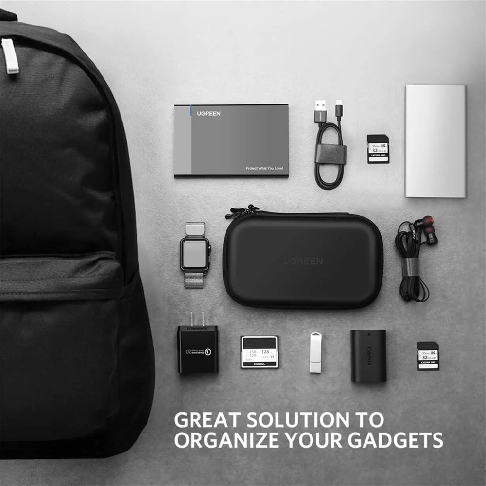 Зовнішній органайзер для HDD UGREEN LP128 Hard Disk Case Small Size (UGR-40707) сумісний з WD My Passport / Seagate Backup Plus Slim Expansion / універсальним кейсом ємністю 1 ТБ, 2 ТБ, 3 ТБ, 4 ТБ, 5 ТБ корпусів жорстких дисків, блок живлення, кабелів, навушників та багато іншого. Зовнішній розмір: 17,5 х 10,5 х 4,8 см; Внутрішній розмір 16 х 8,5 х 4 см. Він відмінно підходить для жорстких дисків або блоків живлення розміром менше 15 х 8 см.