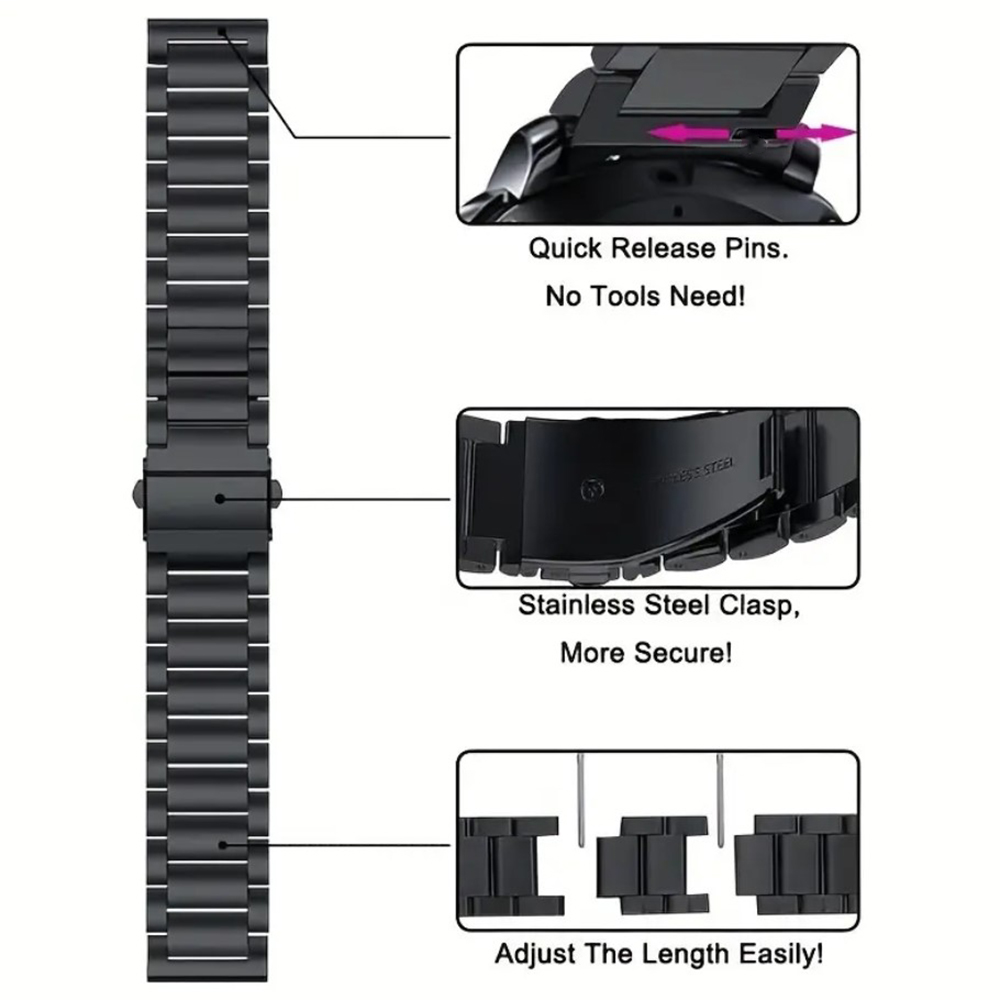 Ремешок оснащен надежной застежкой, которая открывается только при одновременном нажатии кнопок с двух сторон, обеспечивая комфорт и безопасность при ношении. Универсальная длина браслета позволяет легко адаптировать его под размер вашего запястья, а съемные звенья гарантируют идеальную фиксацию.
