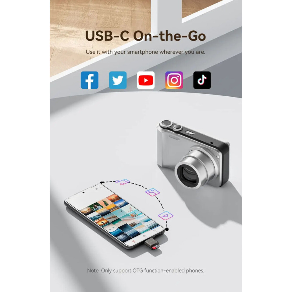 − Поддержка высокой ёмкости: Совместим с широким спектром карт MicroSD, MicroSDHC и MicroSDXC, поддерживает ёмкость до 512 ГБ, что обеспечивает достаточно места для хранения ваших фотографий, видео и файлов.