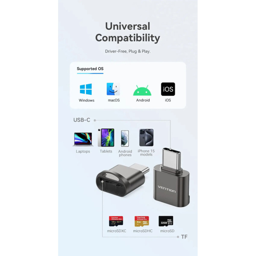 Эффективно управляйте своими данными в пути с помощью картридера Vention USB 2.0 Type-C MicroSD Card Reader. Этот компактный и прочный картридер обеспечивает высокоскоростную передачу данных, универсальную совместимость и удобную портативность, делая его незаменимым аксессуаром для вашего цифрового мира.