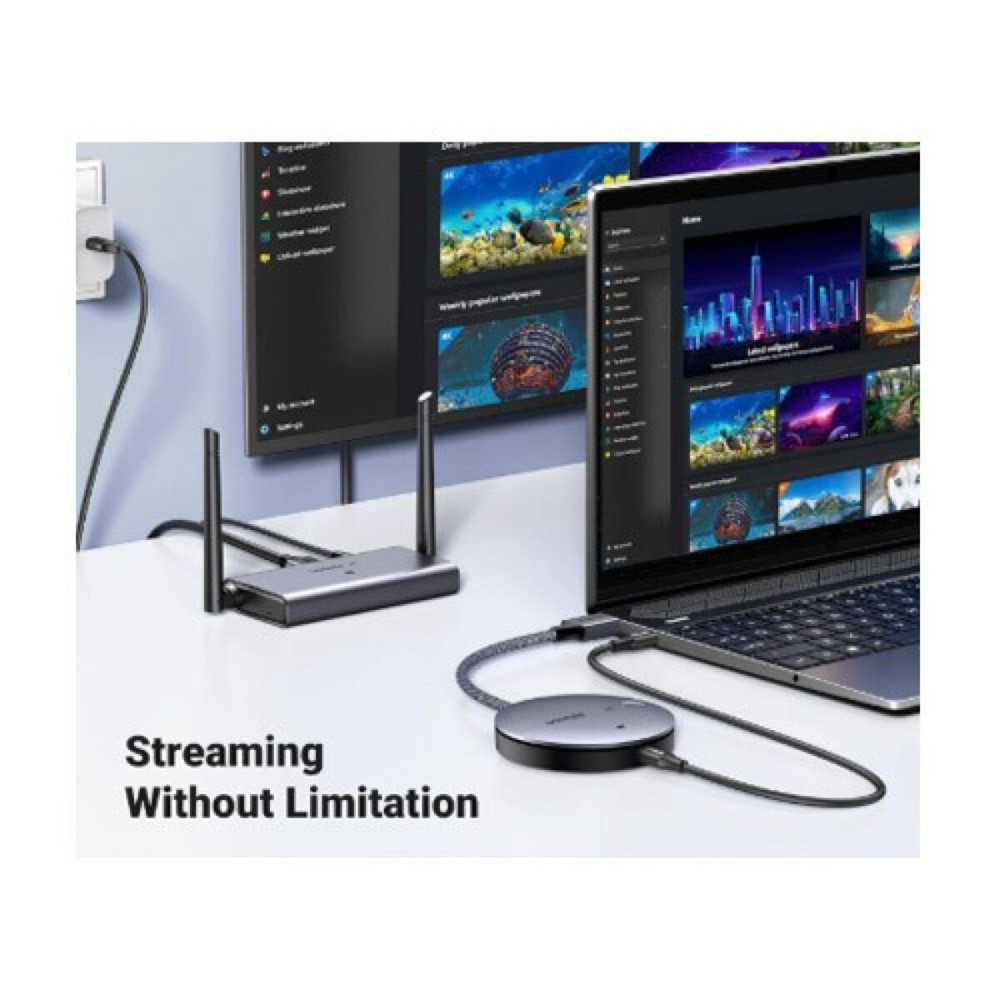 Комплект Ugreen CM586 Wireless HDMI Extender — это современное решение для беспроводной передачи видеосигнала между устройствами с разъемом HDMI. Он позволяет передавать изображение и звук с видеоплееров, ноутбуков или ПК на проекторы, мониторы и телевизоры без необходимости прокладывать длинные кабели, обеспечивая чистое и стабильное соединение.