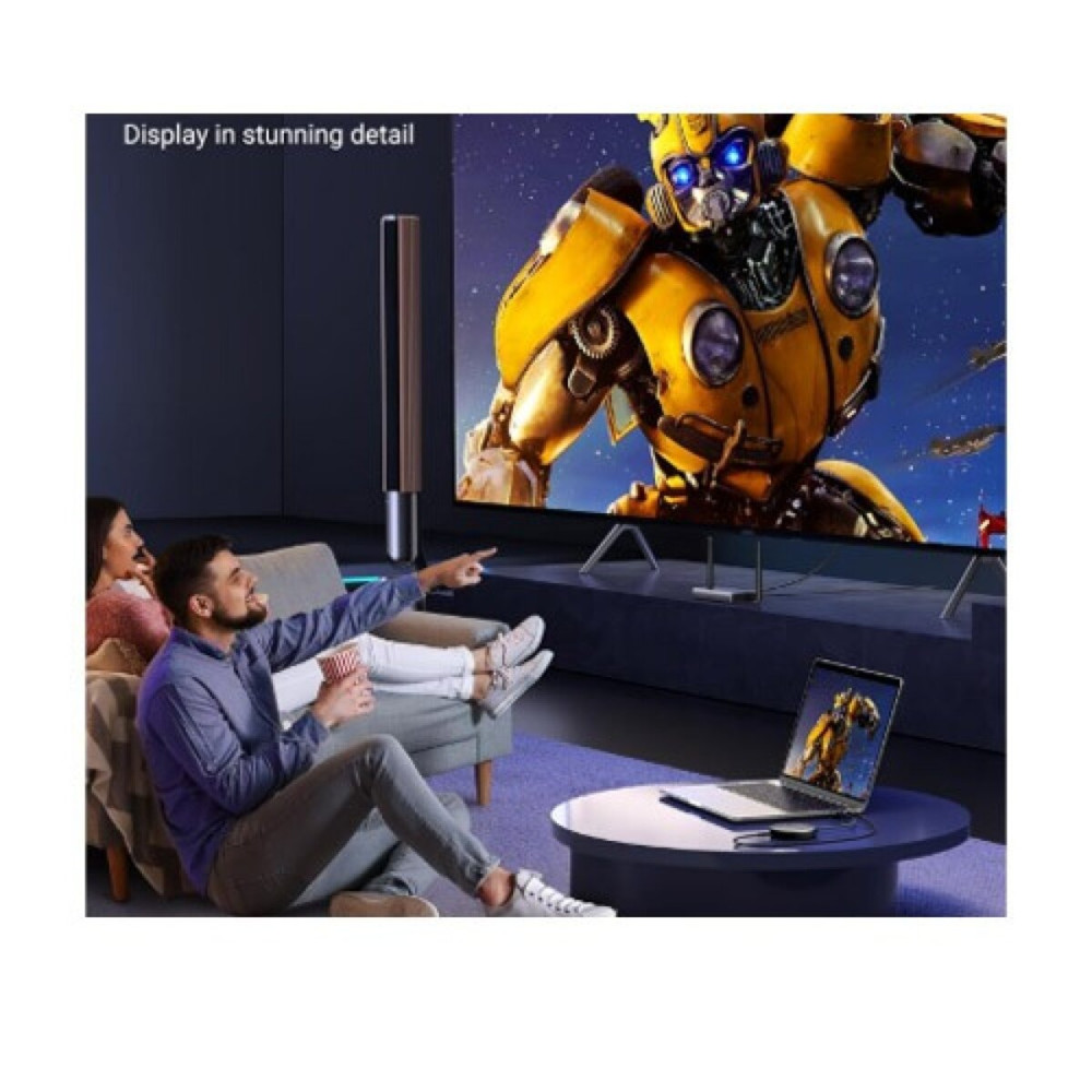 Передатчик оснащен модулем Wi-Fi 5G, который обеспечивает стабильную и скоростную передачу видео без задержек. После подключения устройство мгновенно передает сигнал, позволяя без проводов демонстрировать презентации, видео или игры на большом экране.