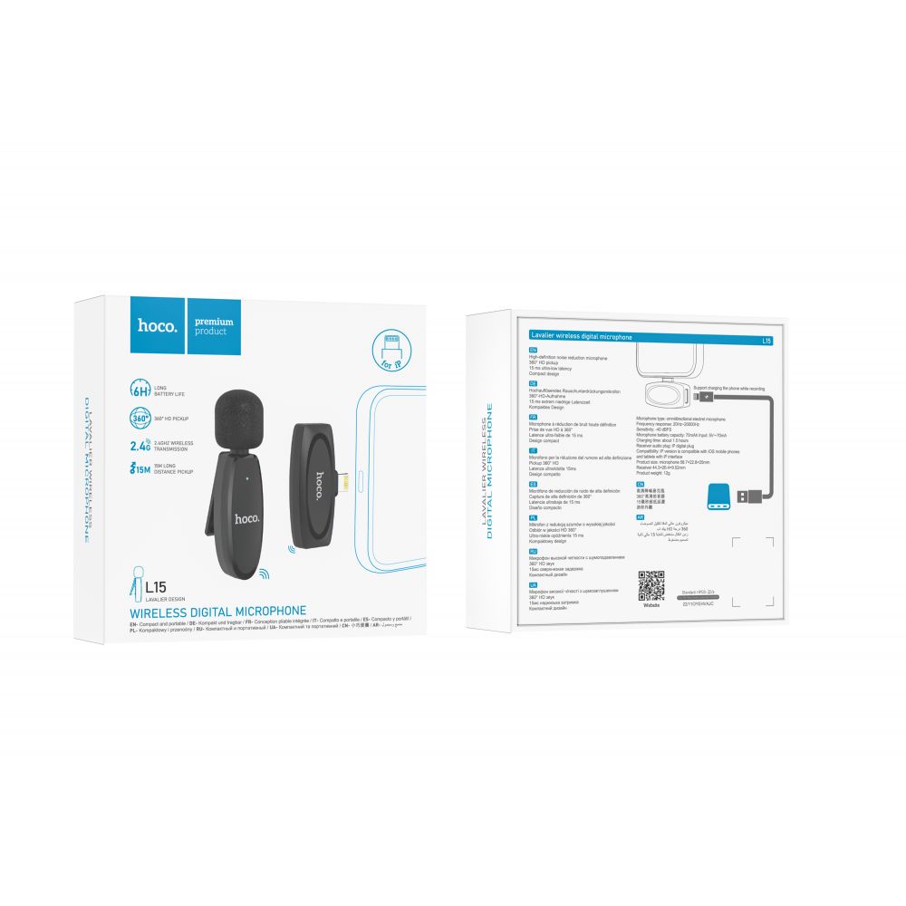 Беспроводной петличный микрофон Hoco L15 Lightning разработан с использованием современных технологий для максимально комфортной записи чистого звука в высоком качестве. Модель выделяется простотой в эксплуатации, имеет небольшие размеры и вес. Ее с удобством можно носить с собой и крепить на одежде в необходимом месте с помощью прищепки. Аксессуар состоит из двух деталей: петличного всенаправленного микрофона электретного типа и беспроводного адаптера для приема звукового сигнала, который предназначен для подключения к звукозаписывающему устройству. Их корпуса надежно собраны, изготовлены из прочного, приятного на ощупь ABS пластика. Головка микрофона прикрыта насадкой из пенополиуретана, которая обеспечивает эффективное улавливание звука без посторонних шумов при движениях и даже сильном ветре. Микрофон оснащен функцией шумоподавления, LED индикатором, кнопкой включения, встроенным аккумулятором емкостью 70mAh и разъемом Type-C для его зарядки. Время его непрерывной работы составит около 6 часов, а время зарядки не займет более 90 минут. Адаптер обеспечивает передачу звука с задержкой всего 15мс по беспроводной связи на частоте 2.4Ghz в радиусе до 15м, снабжен разъемами Lightning male и Lightning female для подключения к смартфону или планшету и их одновременной зарядки. Для его полноценной работы не требуется включение Bluetooth на смартфоне и установка дополнительных приложений. Аксессуар совместим с iPhone и iPad, поддерживает технологию Plug and Play и программное обновление системы.