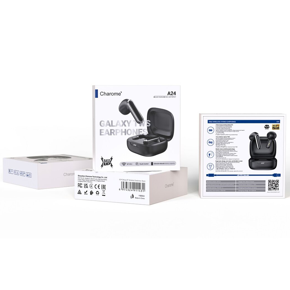 Charome A24 Galaxy BT – это универсальные беспроводные наушники, подключаемые к устройству с помощью Bluetooth. Данная модель позволит своему пользователю наслаждаться любимыми треками во время дел без дискомфорта. Кроме того, аксессуар поддерживает сенсорное управление, что делает его удобным в использовании.