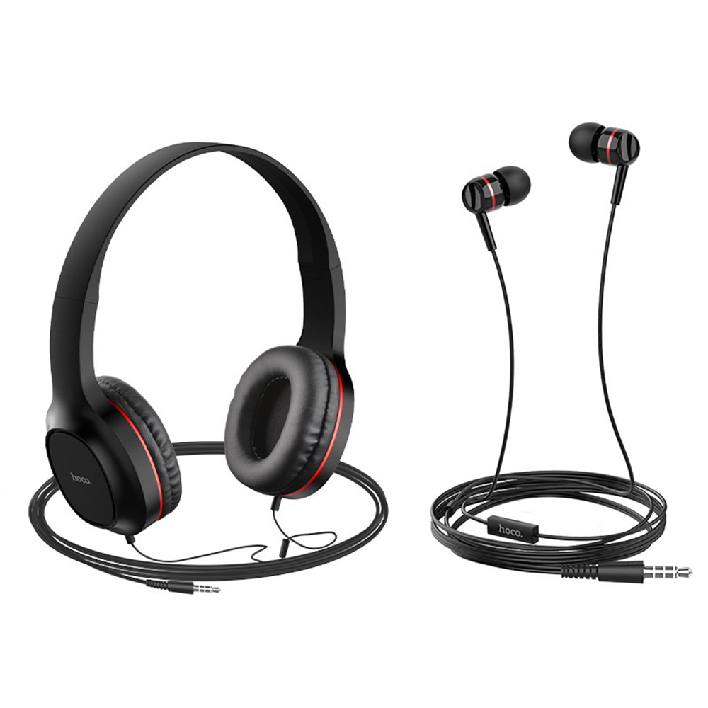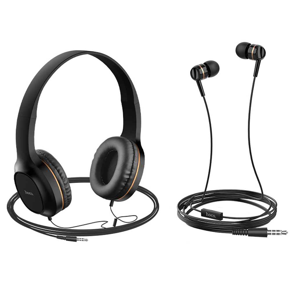 Hoco W24 - это набор, состоящий из наушников двух типов: больших полноразмерных накладок и маленьких вакуумных. Обе модели оборудованы микрофоном, имеют шнур длиной 1,2м с разъемом mini-Jack (3.5 мм).