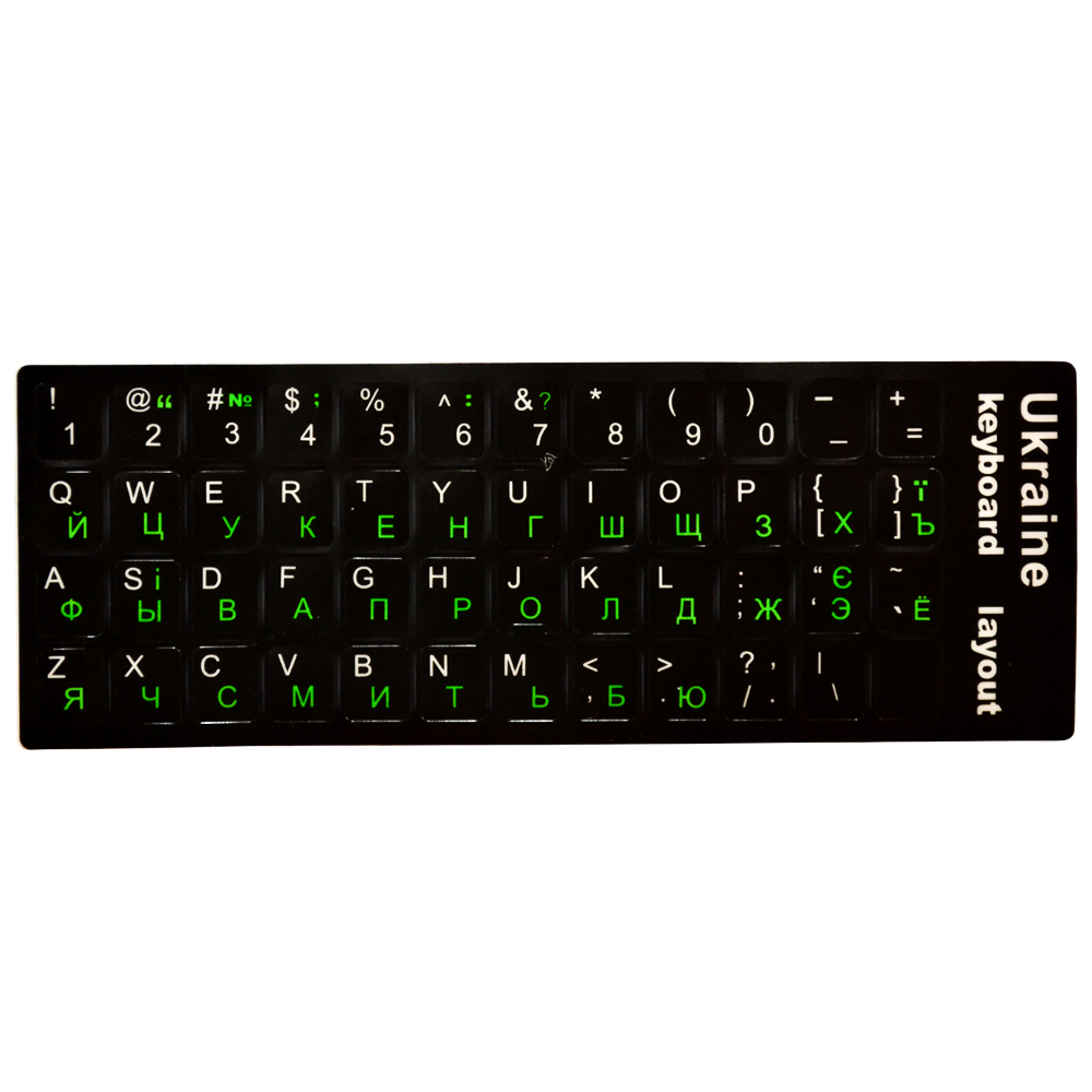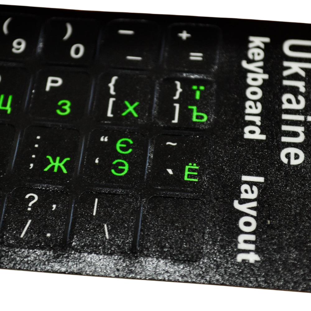 Цветовая схема сочетает черный фон с белыми буквами на английском языке и зелёными — на украинском, придавая клавишам стильный и современный вид. Эти наклейки не только улучшат внешний вид вашей клавиатуры, но и будут полезны тем, кто изучает иностранные языки.