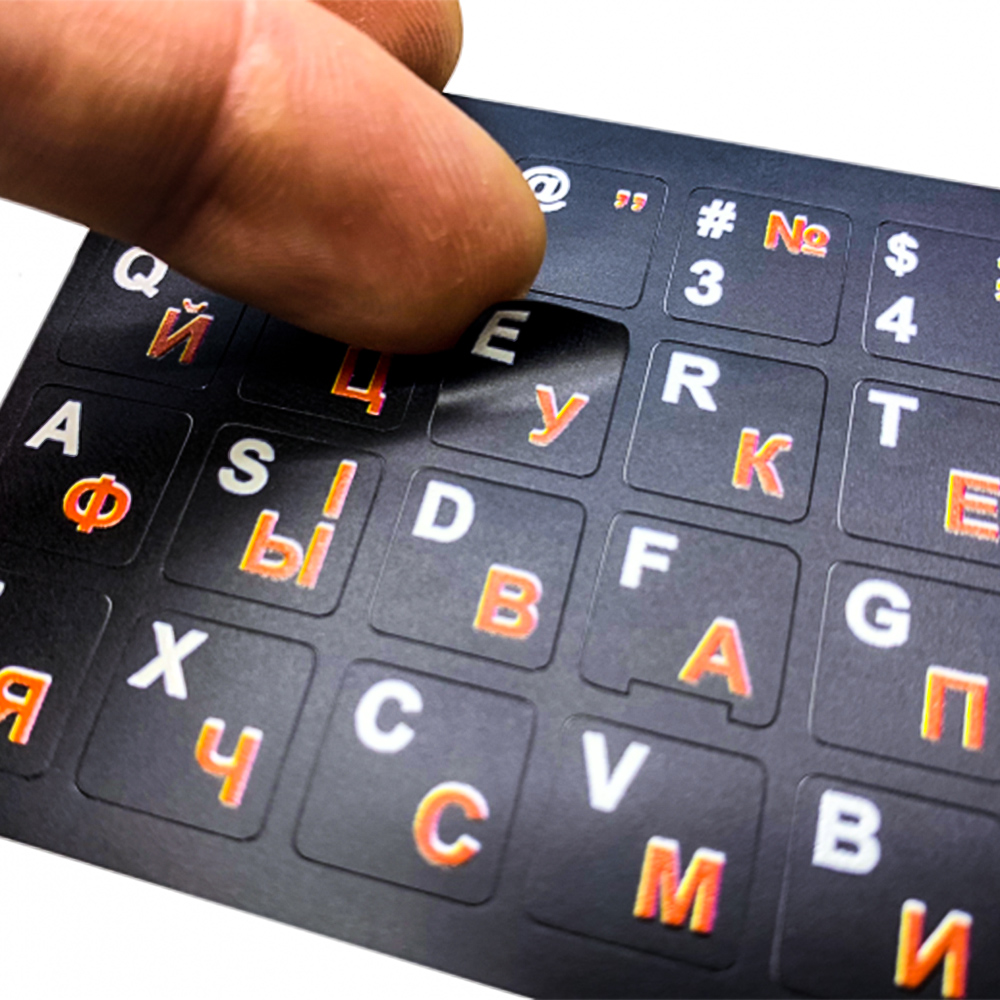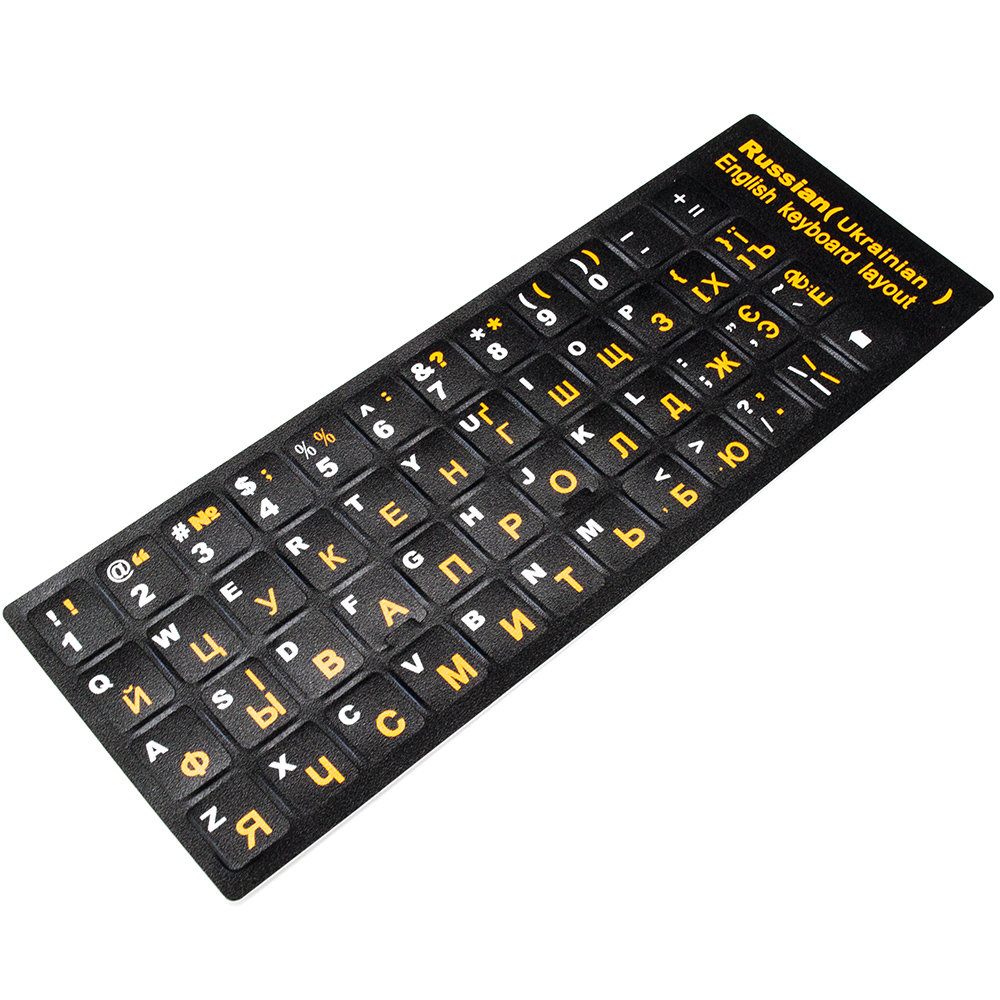 Активные пользователи компьютеров часто сталкиваются с стершимися буквами на клавиатуре или просто нужно изменить раскладку. Рекомендуем качественные наклейки с трехязычной раскладкой: украинский / английский. На клавиатуре размещено 48 клавиш. Визуально все символы выглядят так, как и на большинстве клавиатурах. Латинская раскладка белого цвета, а кириллица – оранжевого. Такая раскладка украсит вашу клавиатуру и дополнительно будет полезна, если вы, например, изучаете иностранный язык.