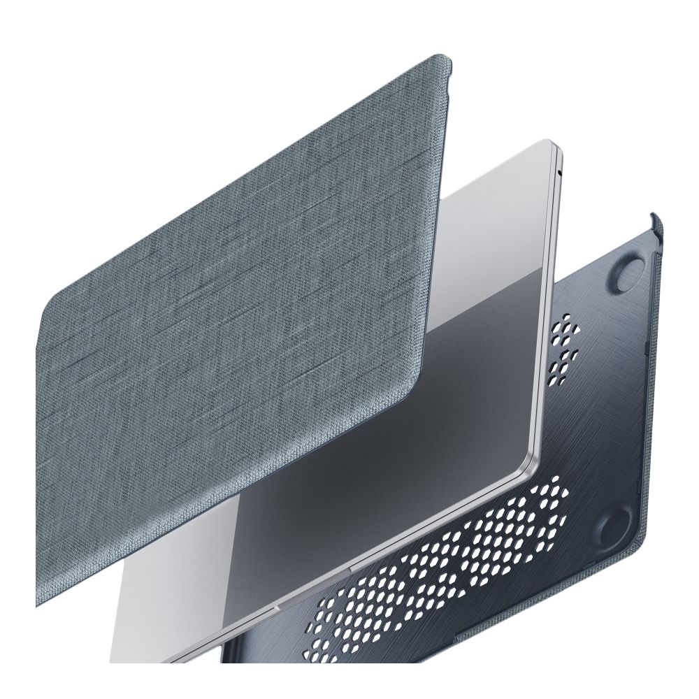 Чехол изготовлен из прочного поликарбоната, дополненного приятной на ощупь текстильной обивкой. Две отдельные панели плотно фиксируются на ноутбуке, не увеличивая его габариты. Материалы устойчивы к ультрафиолету, царапинам, загрязнениям и износу. Специальные вентиляционные отверстия в нижней части способствуют охлаждению устройства, а складная подставка позволяет устанавливать удобный угол наклона экрана.