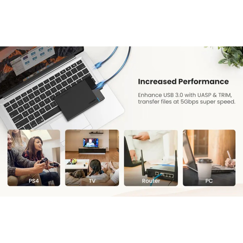 Внешний корпус для жёсткого диска UGREEN US221 — отличное решение для подключения 2.5-дюймовых HDD и SSD с интерфейсом SATA II/III. Благодаря интерфейсу USB 3.0 он обеспечивает скорость передачи данных до 5 Гбит/с, что подходит как для классических HDD, так и для современных SSD.