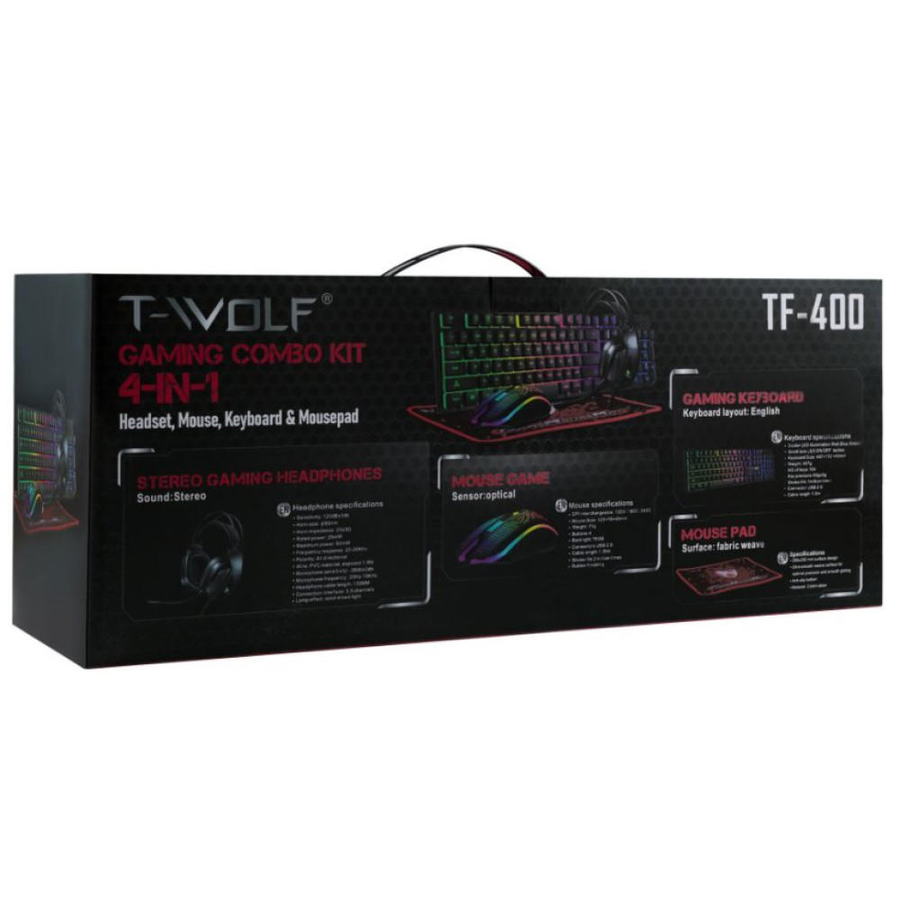 Игровой комплект 4в1 T-Wolf TF-400 — всё необходимое для комфортной и эффективной игры: клавиатура, мышь, наушники и коврик.