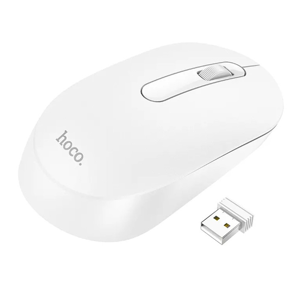 Hoco GM14 – комфортная беспроводная мышка, подключается к другим устройствам с помощью USB адаптера с которым устанавливается связь по частоте 2.4G. Мышка компактная, размеры корпуса 115х64х36 мм, изготовлена из ABS пластика. У модели Hoco GM14 есть три классические клавиши, которые нажимаются достаточно тихо, производитель предоставляет информацию, что клавиши имеют ресурс работы три миллиона кликов, а скролл два миллиона прокруток. Чувствительность курсора составляет 1200DPI. Работает мышка на батарее типа АА.