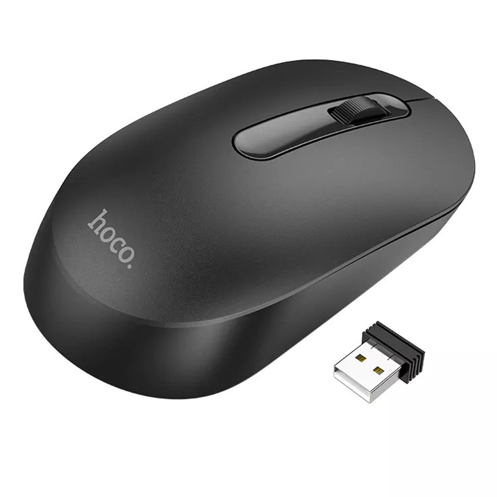 Hoco GM14 – комфортная беспроводная мышка, подключается к другим устройствам с помощью USB адаптера с которым устанавливается связь по частоте 2.4G. Мышка компактная, размеры корпуса 115х64х36 мм, изготовлена из ABS пластика. У модели Hoco GM14 есть три классические клавиши, которые нажимаются достаточно тихо, производитель предоставляет информацию, что клавиши имеют ресурс работы три миллиона кликов, а скролл два миллиона прокруток. Чувствительность курсора составляет 1200DPI. Работает мышка на батарее типа АА.