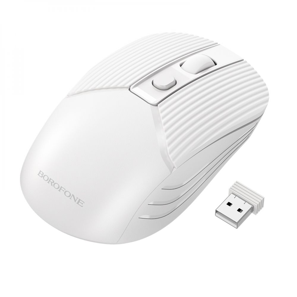 Беспроводная мышка Borofone BG5 - это качественное устройство, выполненное в уникальном, практичном дизайне. Универсальность и симметричная форма данного аксессуара делают его отличным выбором для использования как левой, так и правой рукой для удобного, быстрого выполнения всех необходимых действий на компьютере в офисных приложениях или играх. Модель предлагается в черном и белом цветах, обладает привлекательным внешним видом и идеально сбалансированным весом. Ее корпус реализован в эргономичной форме из прочного пластика с глянцевыми и матовыми деталями, приятной на ощупь ребристой поверхностью на кнопках и боковых панелях, которая предотвращает скольжение пальцев. Модель оснащена двумя стандартными кнопками, кнопкой-колесиком и дополнительной кнопкой для смены DPI на лету, позволяющей выбрать чувствительность 800, 1200 и 1600DPI. К компьютеру мышь подключается через беспроводную связь на частоте 2.4Гц для чего имеется компактный USB адаптер, а источником питания для нее служит обычная пальчиковая батарейка.