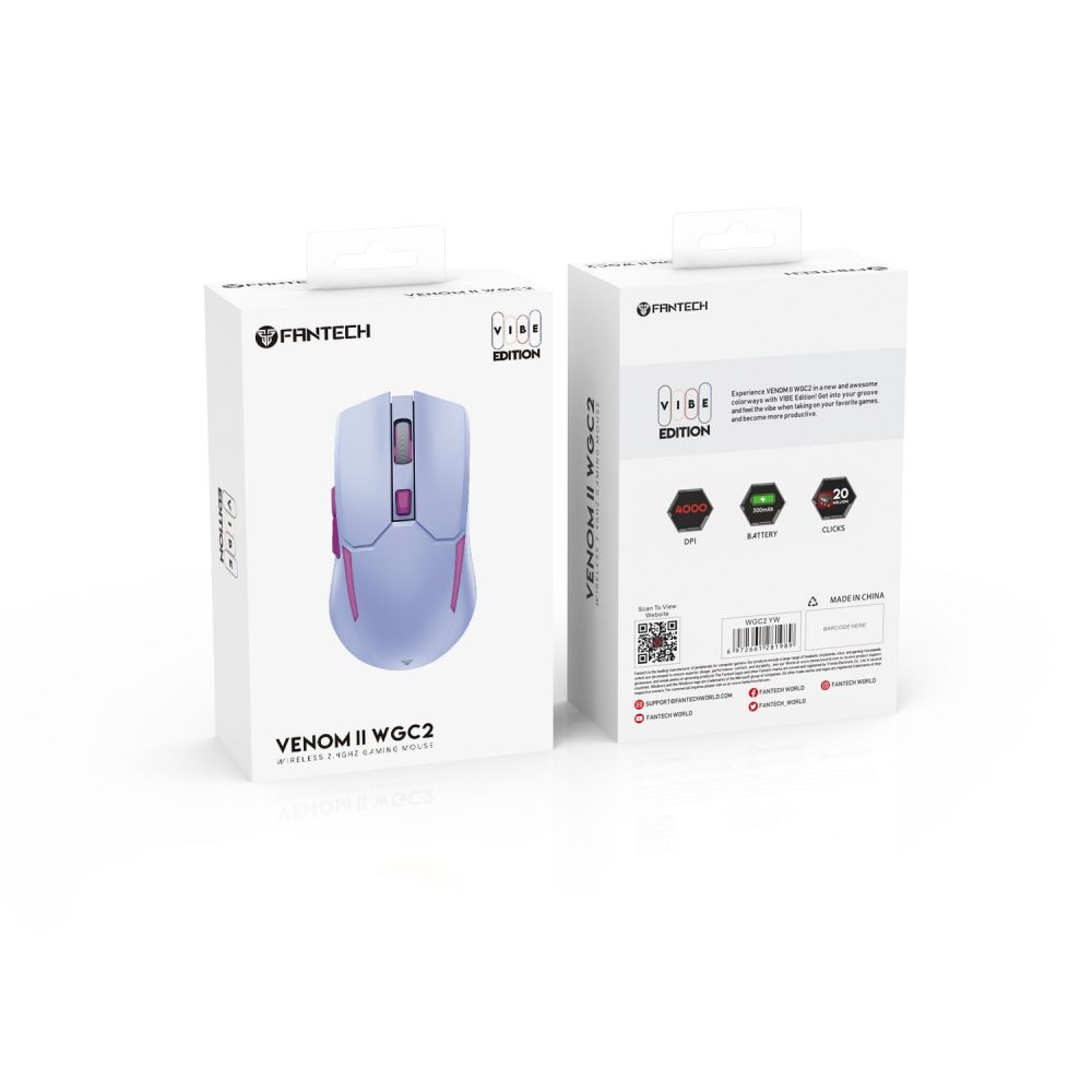 Fantech WGC2 Venom II Vibe - это беспроводная геймерская мышь, разработанная для максимально комфортной, эффективной игры и удобного выполнения других повседневных задач. Модель реализована в оригинальном дизайне с RGB подсветкой, которая создает завораживающий световой эффект, подсвечивая колесо прокрутки и вставки корпуса. Приятный для глаз свет не будет отвлекать внимание и создаст особую атмосферу во время игры. Корпус устройства имеет симметричную, эргономичную форму, изготовлен из прочного ABS пластика. Глайды на его нижней панели изготовлены из износостойкого полимерного материала. Модель оснащена функциональным колесиком, парой стандартных кнопок, кнопками смены DPI и включения, а также двумя дополнительными кнопками, удобно расположенными с левой стороны. Их переключатели Huano выделяются отличным откликом и повышенным ресурсом нажатий, который составляет 20млн раз. Игровой оптический сенсор Pixart 3220 точно и быстро отслеживает движение мыши со скоростью до 30IPS, ускорением 10G и чувствительностью от 800 до 4000DPI. Частота опроса равна 125Hz. Встроенный аккумулятор емкостью 300mAh избавит от постоянной необходимости замены батареек, заряжается через разъем Type-C, который расположен в торце мыши. Ее беспроводное соединение с компьютером на частоте 2.4GHz в радиусе до 10м осуществляется с помощью компактного USB адаптера.