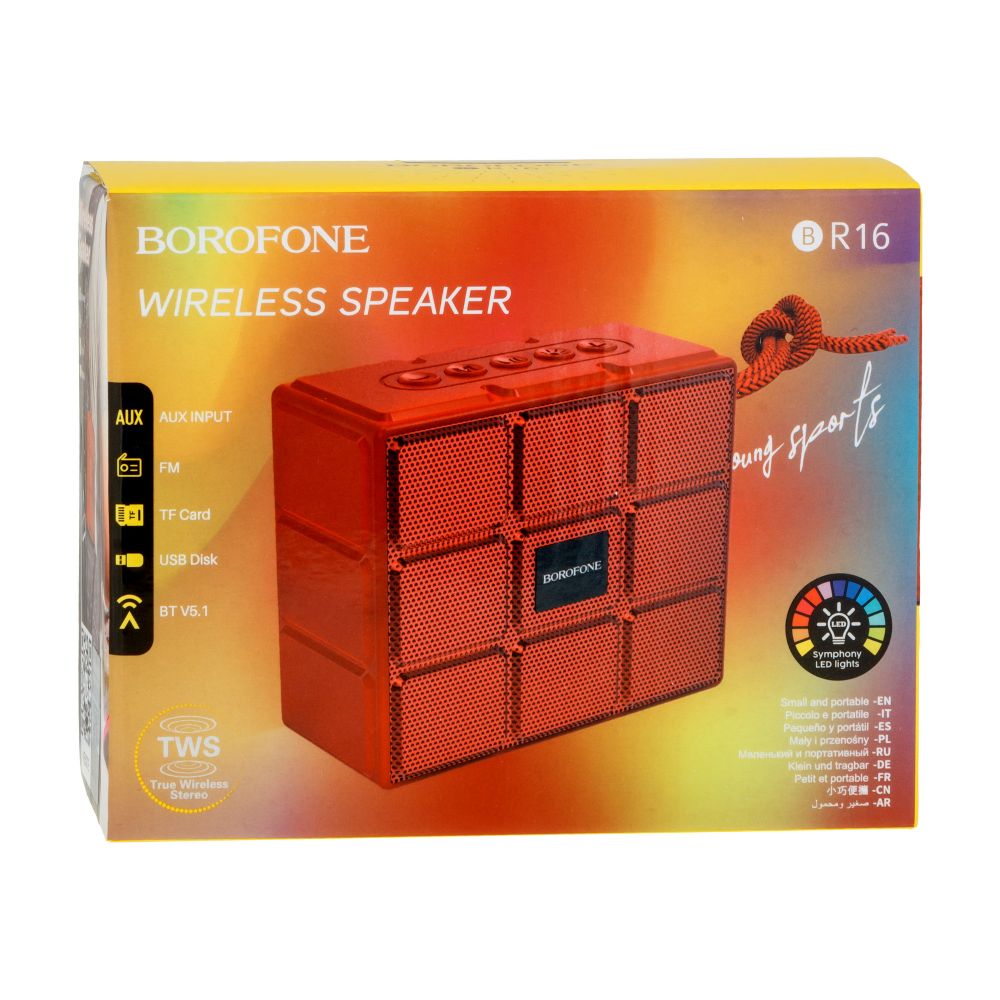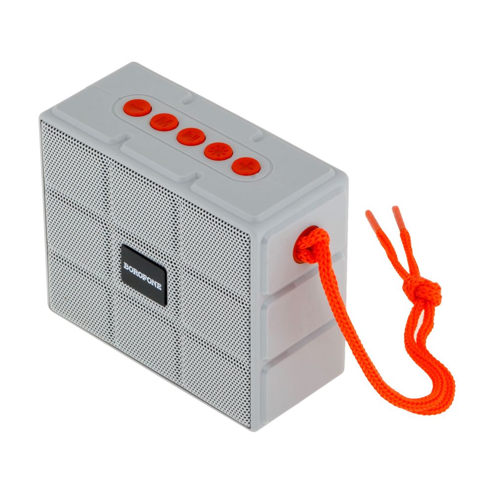 Портативная колонка Borofone BR16 - модель с ярким дизайном и реалистичным звуком, передающим все нюансы музыкальных композиций. Аксессуар имеет компактные размеры подойдет для использования дома и, например, во время прогулок, походов и отдыха на природе. При этом, дополнительный комфорт в повседневную эксплуатацию внесет наличие короткого шнурка. Корпус устройства надежно собран, изготовлен из прочного пластика, выполнен в прямоугольной форме. Большая его часть стилизована квадратами, включая решетку, прикрывающую динамик диаметром 52мм и мощностью 5Вт. На верхней панели колонки находятся кнопки управления воспроизведением, кнопка включения и все разъемы, в том числе разъем Micro-USB для зарядки, расположены на его задней панели, над пассивным излучателем, подсвечиваемым RGB подсветкой. Модель способна воспроизводить музыку с различных источников, оснащена разъемами AUX и USB, слотом для карт памяти, FM приемником, модулем Bluetooth V5.1 и микрофоном. Встроенный аккумулятор емкостью 1200mAh обеспечивает непрерывную работу колонки в течение 4 часов. Устройство комплектуется кабелем Micro-USB и инструкцией.