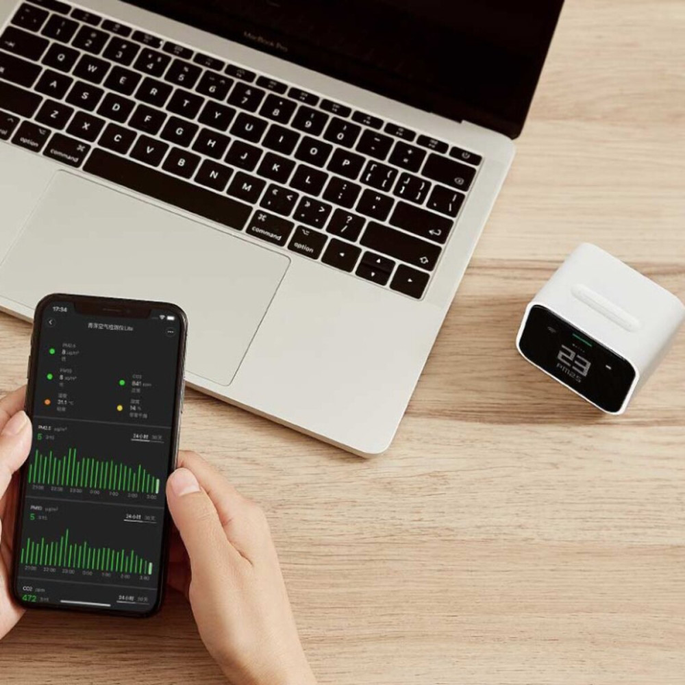 Xiaomi Qingping Air Detector Lite имеет комплексные функции и обеспечивает пять измерений данных, включая PM2.5, PM10, CO2, температуру и влажность. С помощью определения концентрации CO2 можно увидеть, как цвет индикатора изменяется с зеленого в нормальном диапазоне (0~1000 ppm) или даже на фиолетовый при слишком высокой концентрации углекислого газа (более 3000 ppm).