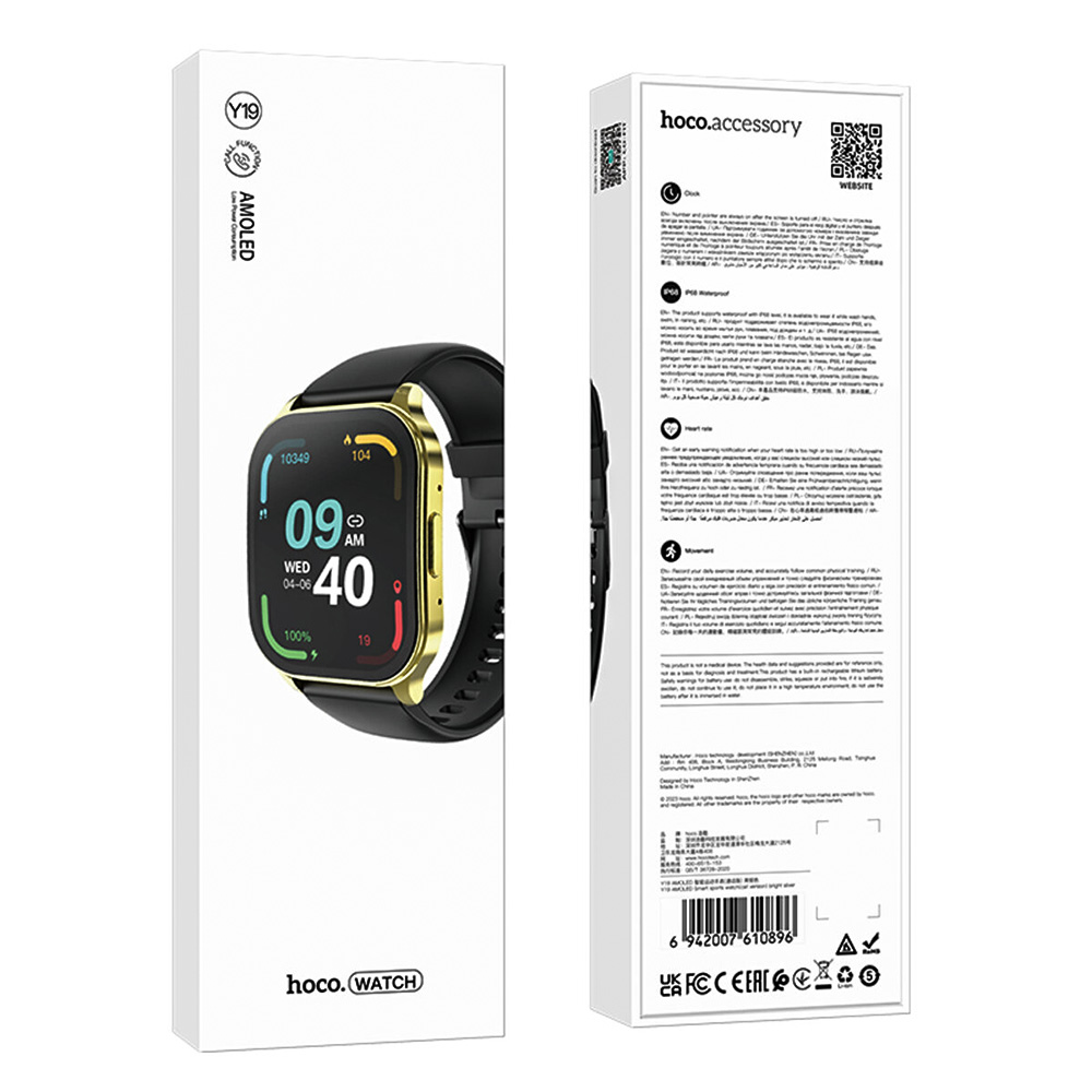 Смартчасы Hoco Y19 – это новейший девайс, обладающий широким функционалом для активного образа жизни. Призван помочь вам в выполнении повседневных задач, сделать ваши тренировки и отдых более продуктивными. Аксессуар имеет компактные размеры и небольшой вес, привлекательно смотрится на руке. Его корпус выполнен в практической форме с элегантными изгибами, изготовлен из алюминиевого сплава. Благодаря защите от воды и пыли по стандарту IP68, устройство можно не снимать во время мытья рук. Его отличительной особенностью является высококачественный AMOLED экран с разрешением 502х410. Выделяется отличной контрастностью с глубоким черным цветом, яркой равномерной подсветкой и широкими углами обзора. Его широкий функционал позволит управлять некоторыми функциями смартфона, следить за показаниями организма и дополнен спортивными режимами для более эффективных тренировок. Встроенный аккумулятор емкостью 300mAh позволяет использовать часы в течение 7-10 дней без подзарядки. Для его беспроводной зарядки есть USB-кабель, входящий в комплект.