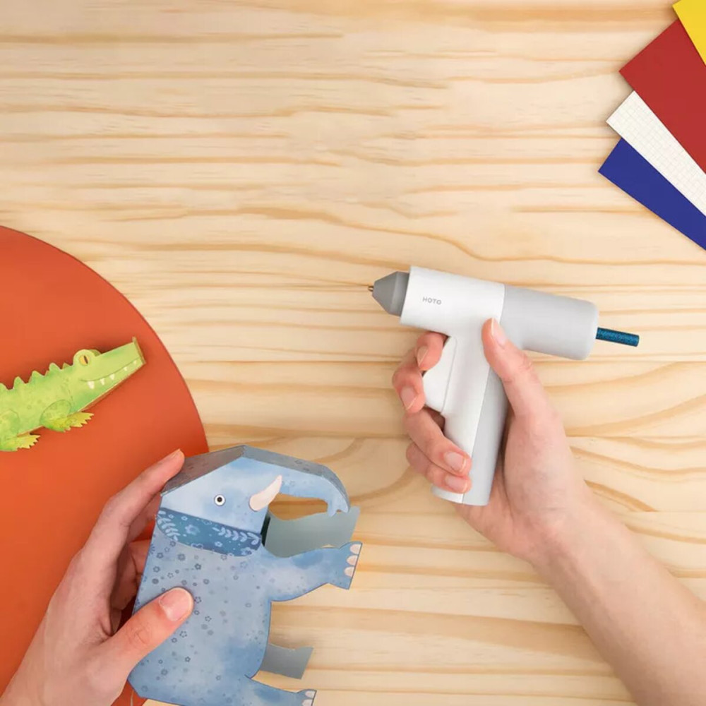 Клеевой пистолет автоматически выключается через 3 минуты бездействия для экономии энергии и продления срока службы аккумулятора. Внешняя оболочка покрыта экологически чистым, термостойким силикагелем, что повышает изоляцию и износостойкость. Поликарбонатная крышка позволяет удобно защищать клеевое сопло после использования, а впускной патрубок выполнен из безопасного и долговечного силикона.