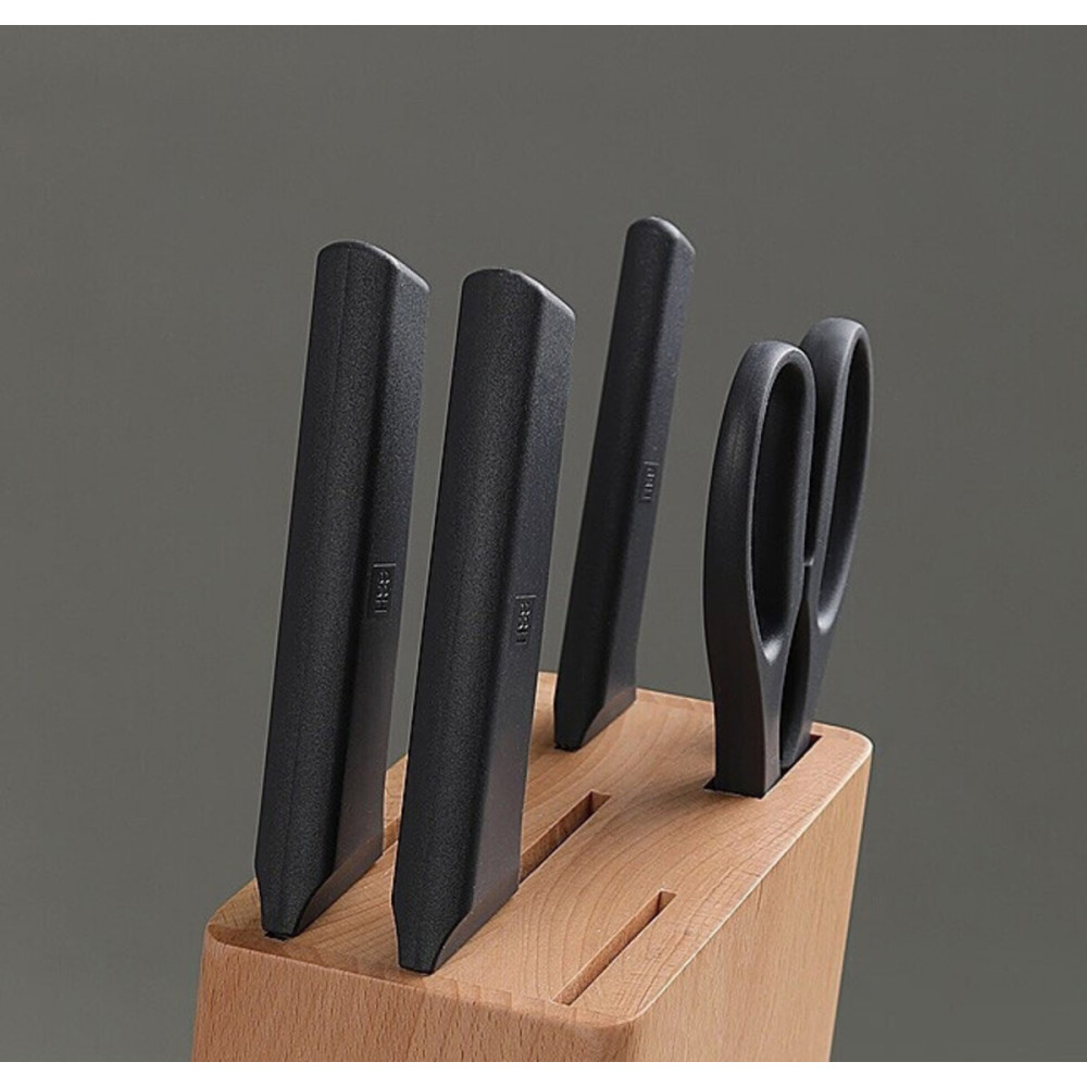 — 6 предметов в одном наборе: 4 ножа для разных задач, кухонные ножницы и деревянная подставка для аккуратного хранения.