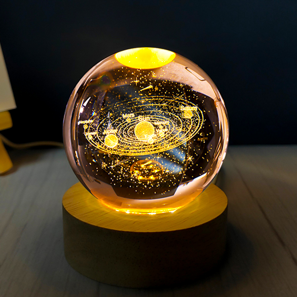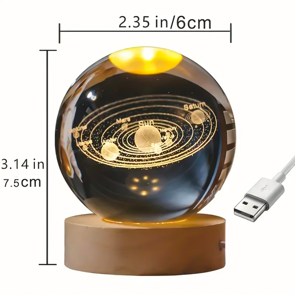 Декоративная лампа 3D-ночник "Crystal Ball" – это компактный декоративный светильник, который состоит из хрустального шара с выгравированным 3D-изображением Солнечной системы и деревянного основания, оснащённого LED-подсветкой.