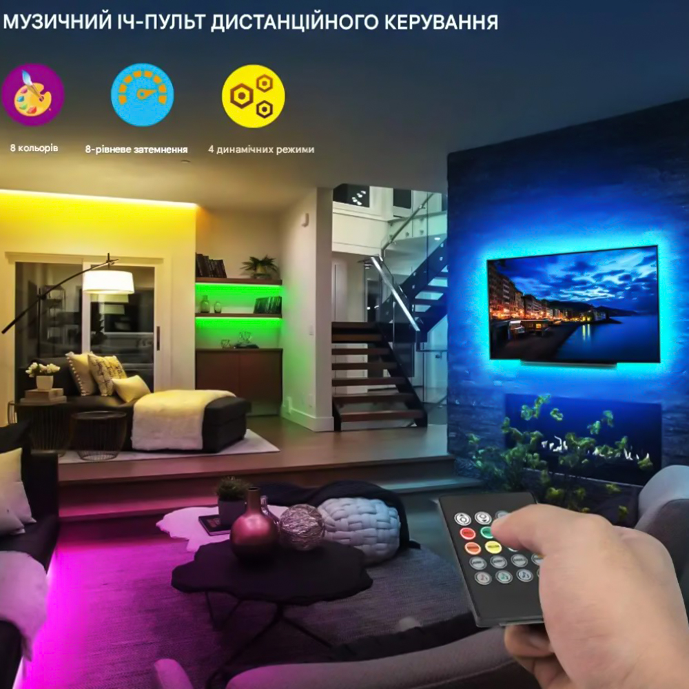 Встроенный музыкальный режим позволяет LED ленте синхронизироваться с ритмом музыки или звуком фильма – идеально для вечеринок или атмосферного просмотра.