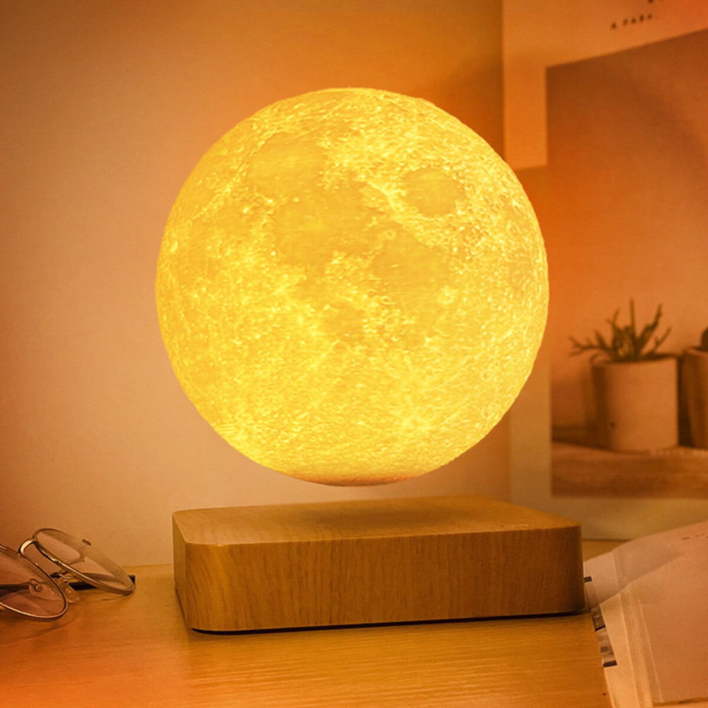 Светильник «луна» парит над деревянным основанием, удерживаясь с помощью магнитного поля. Медленное вращение создаёт успокаивающий эффект и добавляет интерьеру динамики.