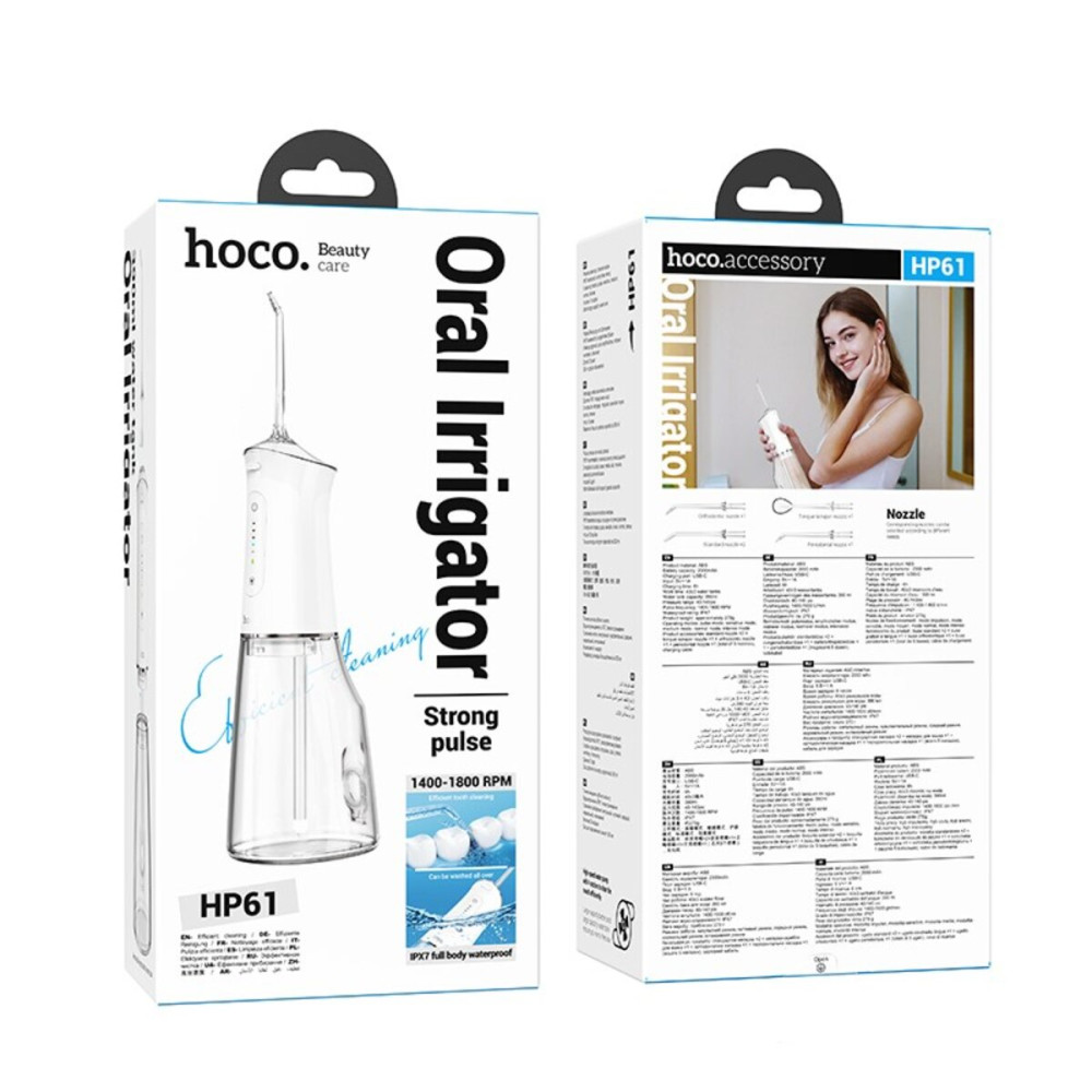 Іригатор HOCO HP61 Electric oral flushing device with large-capacity water tank — це незамінний помічник для ретельного догляду за ротовою порожниною. З цим портативним іригатором у вас завжди буде можливість забезпечити комплексний догляд за зубами та яснами. Завдяки йому ви зможете досягати ідеальної гігієнічності навіть у важкодоступних зонах, які зазвичай залишаються недостатньо чистими при використанні зубної щітки.ОТРИМАЙТЕ ЗДОРОВУ УСМІШКУ БЕЗ ЗАЙВИХ ЗУСИЛЬВикористання іригатора HOCO HP61 — це ваш шанс подарувати собі здорові зуби та гарну усмішку без постійних походів до стоматолога. У комплекті з іригатором ви отримуєте 5 насадок. Цей портативний помічник має різні режими роботи, що дозволяє підібрати найбільш комфортний та ефективний режим для вас.ПОТУЖНИЙ СТРУМІНЬ ВОДИ ДЛЯ ІДЕАЛЬНОЇ ЧИСТОТИСпеціальний механізм розпилення іригатора HOCO HP61 забезпечує частоту водних імпульсів у 1800 разів на хвилину, що дозволяє видаляти до 99,9% зубного нальоту. Ефективність його роботи допомагає запобігти карієсу та пародонтозу, підтримуючи вашу ротову порожнину в ідеальній чистоті.ЗРУЧНІСТЬ ТА ДОВГОВІЧНІСТЬHOCO HP61 зручний та простий у використанні. Він має водонепроникність, тому ви можете безпечно використовувати його навіть під душем. Резервуар об'ємом 390 мл спроектовано так, щоб забезпечити повний цикл роботи з мінімальною необхідністю додаткової підзарядки.ДОВГИЙ ТЕРМІН СЛУЖБИ ТА ЕКОЛОГІЧНИЙ МАТЕРІАЛЗ акумулятором ємністю 2000 мАг пристрій може працювати довгий час без заряджання. Він виконаний з високоякісного пластику, що робить його екологічно безпечним та придатним для щоденного використання. Подбайте про здоров'я вашої ротової порожнини з іригатором і насолоджуйтесь сліпучою посмішкою щодня.