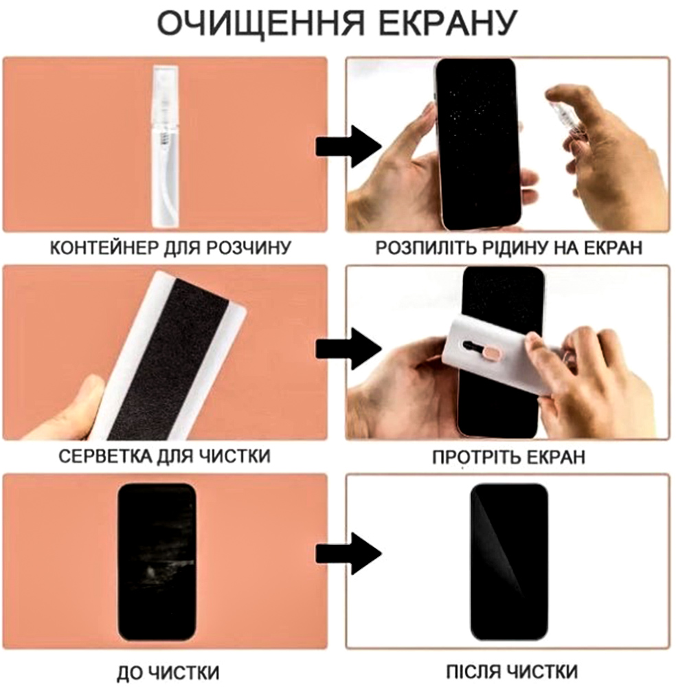 - Бутылку с распылителем, вместе с жидкостью, которая пригодится для экрана гаджета.