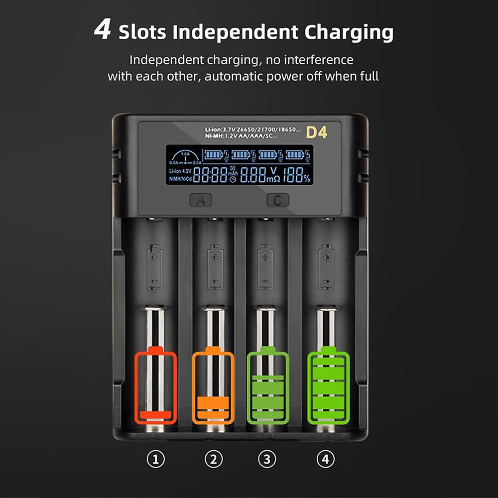 Зарядное устройство оснащено LED дисплеем, показывающим состояние заряда каждого аккумулятора. Это позволяет легко отслеживать процесс подзарядки.