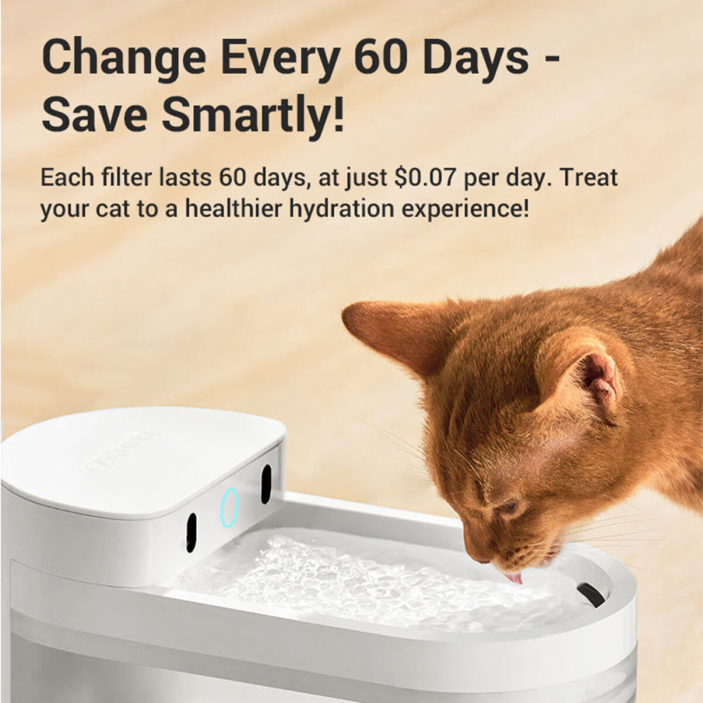 Фильтр Catlink Water Fountain Filter для Pure 3 изготовлен из прочного пищевого ABS-пластика и оснащён обновлённой шестислойной системой очистки. Он эффективно очищает и смягчает воду, обеспечивая питомцам безопасное и полезное питьё.