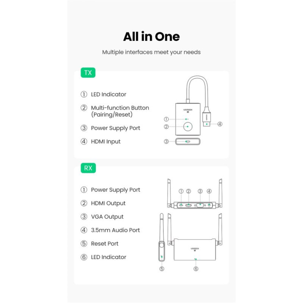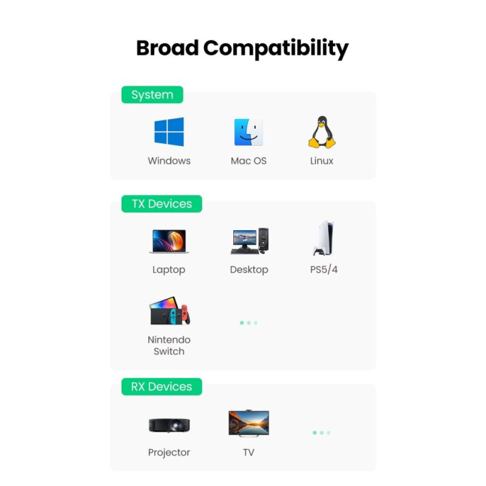 Комплект передавача та приймача дозволяє бездротово передавати відеосигнал з HDMI-пристроїв, таких як комп’ютери чи медіаплеєри, на монітори та проектори. Це зручне рішення для офісів, конференц-залів або дому, яке допомагає уникнути прокладання довгих і незручних кабелів.