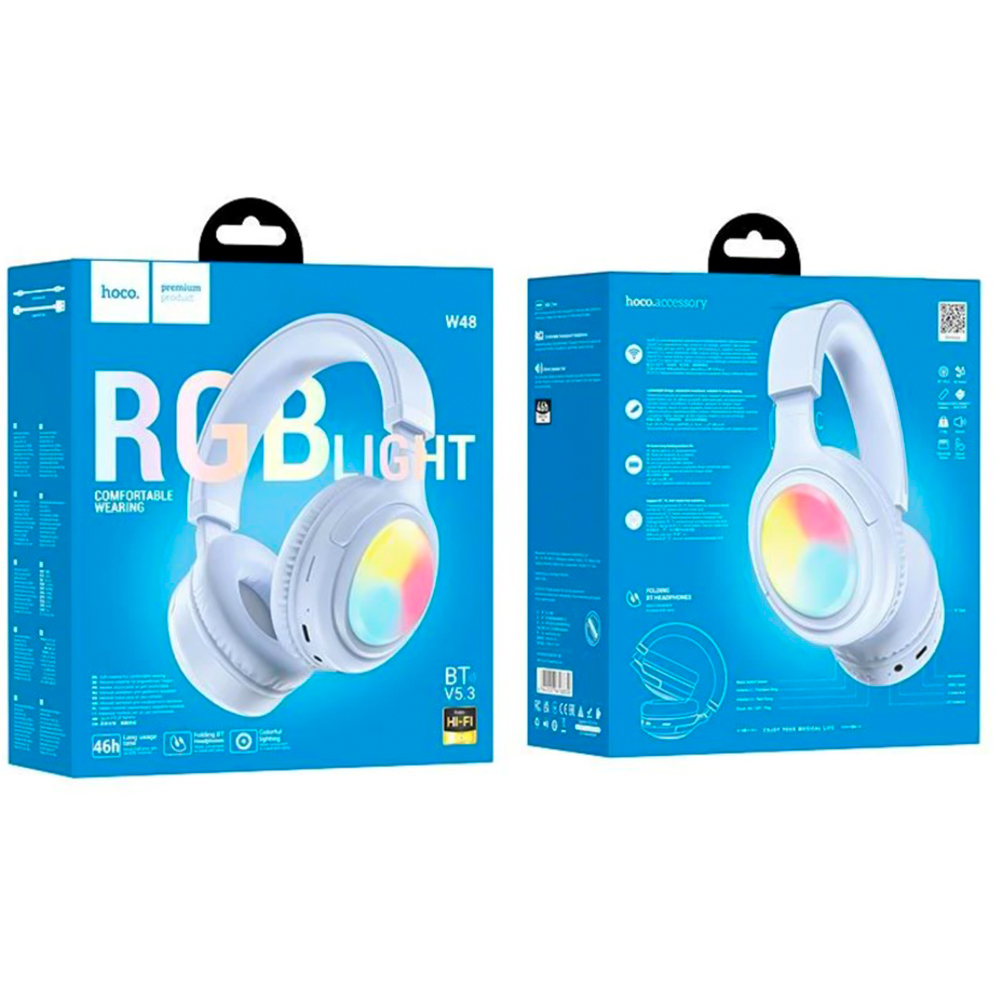 Bluetooth-гарнітура Hoco W48 – це стильні та зручні навушники, які забезпечують комфортне використання та високу якість звуку. Ця модель вирізняється елегантним дизайном: глянцеві накладки на вушних елементах доповнені динамічним RGB підсвічуванням, яке привертає увагу та підкреслює сучасний стиль. Корпус виготовлений із міцного ABS-пластику, а м'які амбушури обшиті зносостійким кожзамом, що гарантує довговічність і комфорт навіть при тривалому використанні.