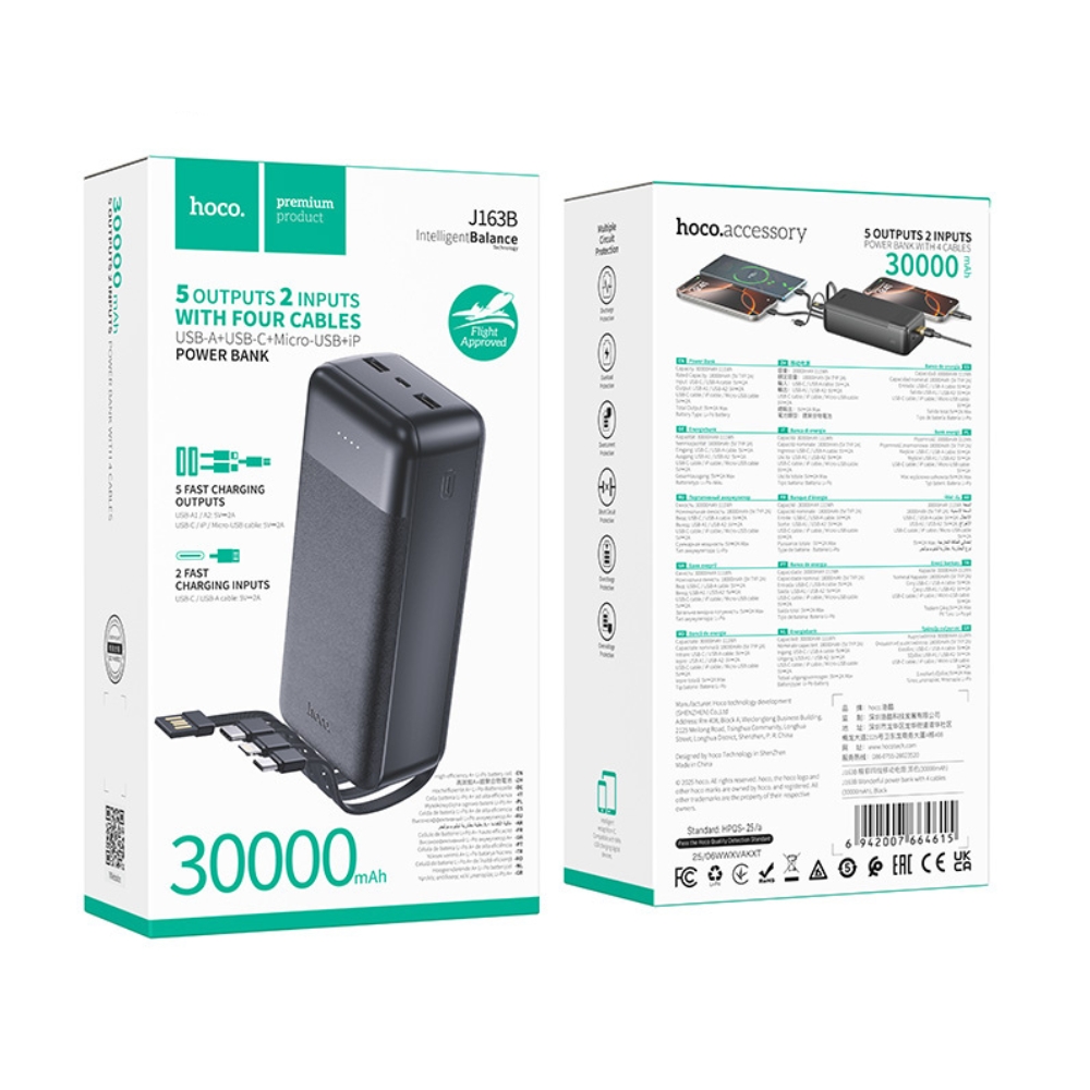 HOCO J163B — це потужний пауербанк для тривалих подорожей, відряджень і насичених днів, коли смартфон працює без перерв. Ємність 30 000 mAh забезпечує багаторазову зарядку телефону, навушників, смартгодинника чи портативної колонки — де б ви не були. Модель оснащена трьома вбудованими кабелями (USB-C, Lightning, Micro-USB) та двома додатковими USB-портами. Це дозволяє заряджати до п’яти пристроїв одночасно без необхідності носити з собою додаткові дроти. Ідеальне рішення для подорожей компанією або для користувачів кількох гаджетів. Корпус із вогнестійкого PC+ABS-пластику надійно захищає батарею від пошкоджень. Попри велику ємність, пристрій зручний у транспортуванні та розрахований на активне щоденне використання.