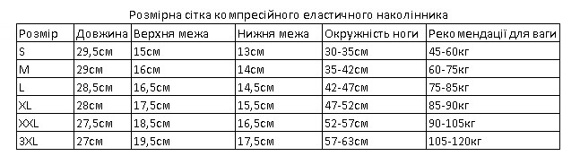 Компресійний еластичний наколінник представлений у 6 розмірах. Для визначення свого потрібно зміряти окружність ноги за 10-15см вище коліна.